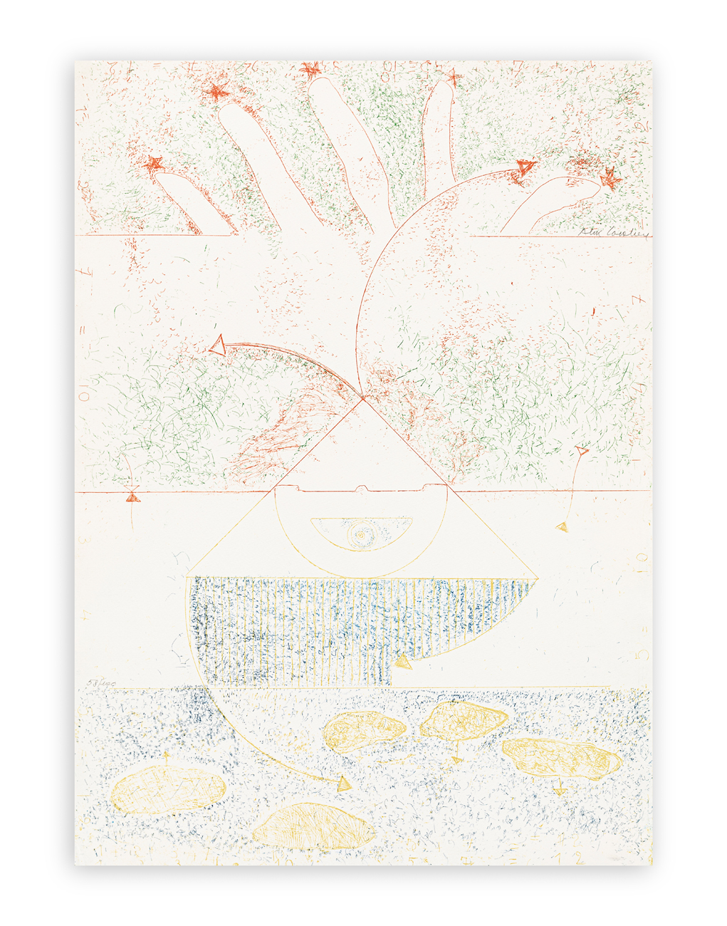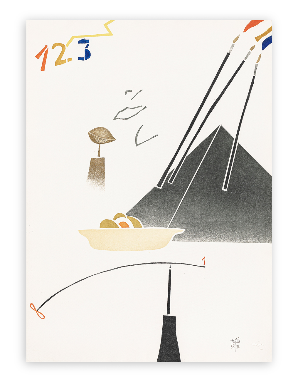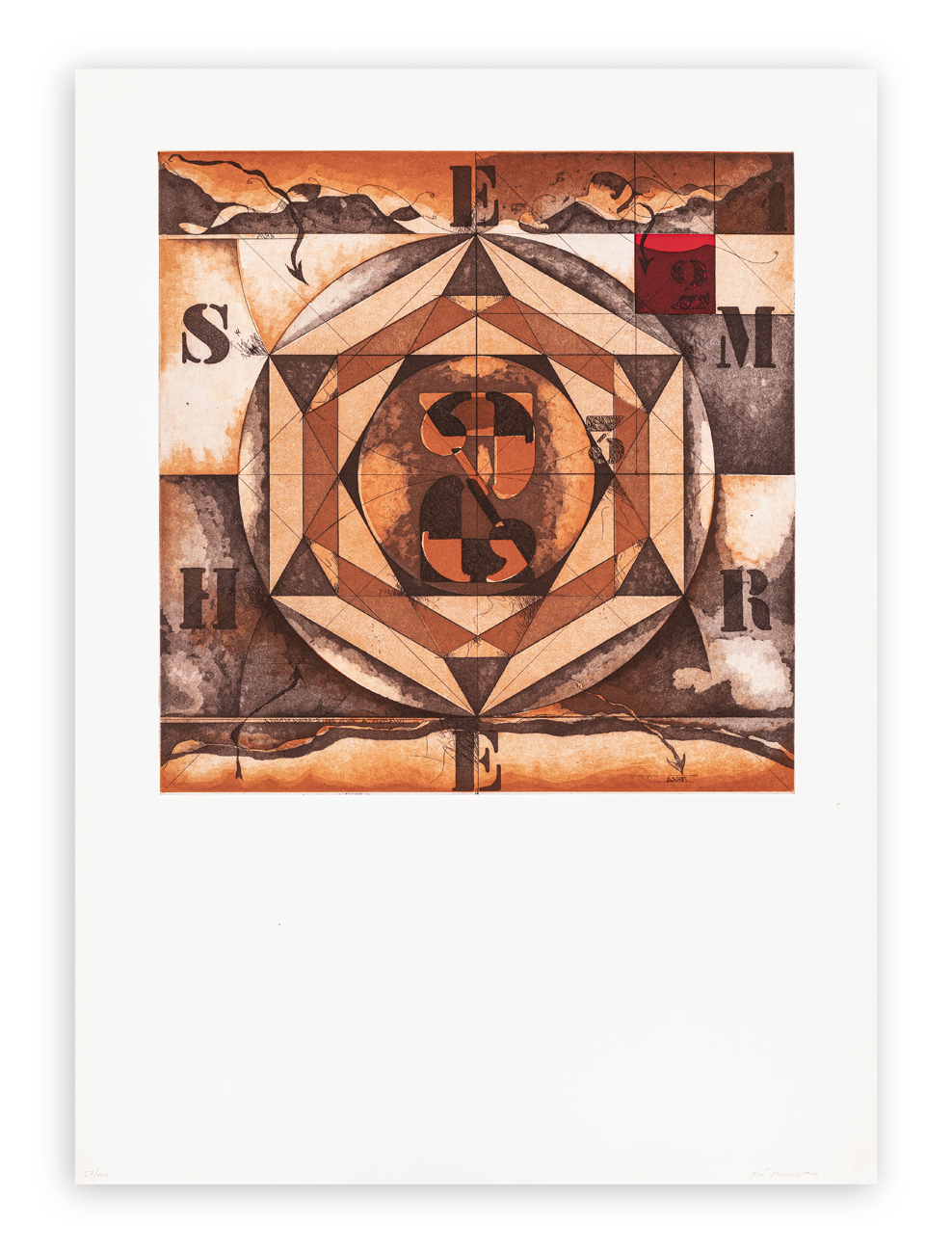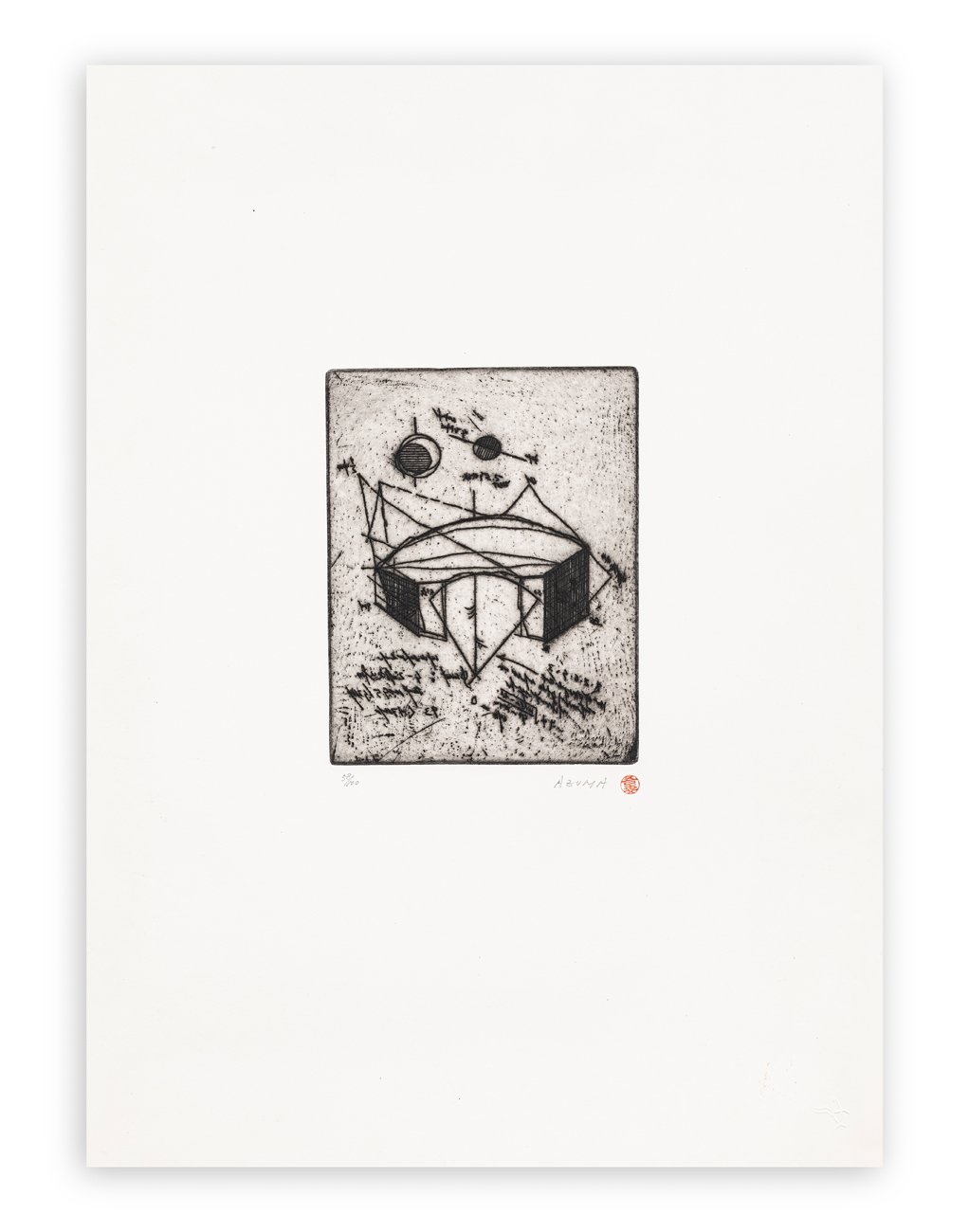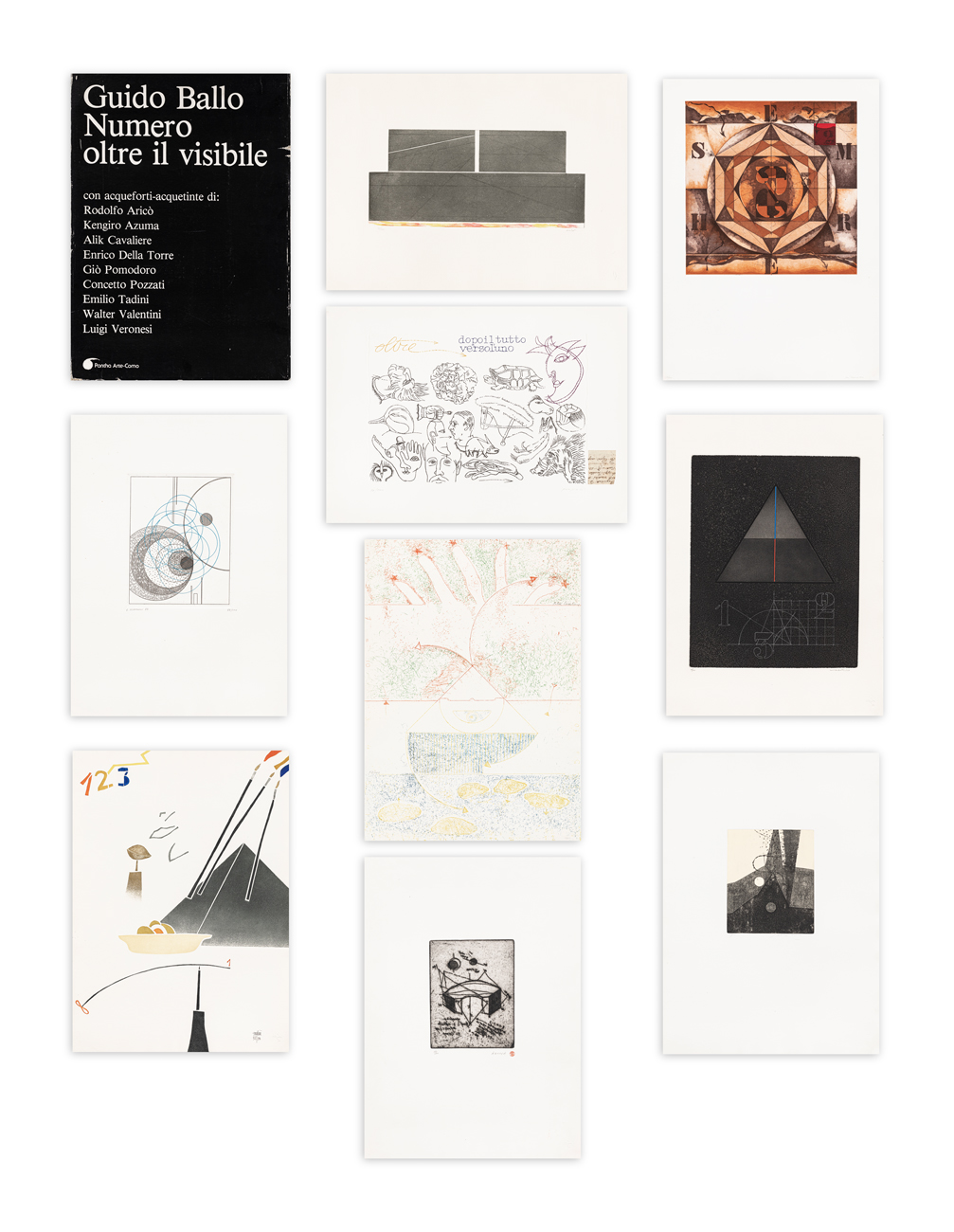 Cartella curata da Guido Ballo contenente 9 acqueforti-acquetinte di Rodolfo Aricò, Kenjiro Azuma, Alik Cavaliere, Enrico Della Torre, Giò Pomodoro, Concetto Pozzati, Emilio Tadini, Walter Valentini e Luigi Veronesi, ciascuna recante firma e numerazione (Esemplari 58/100) a matita al fronte e timbro a secco dello stampatore