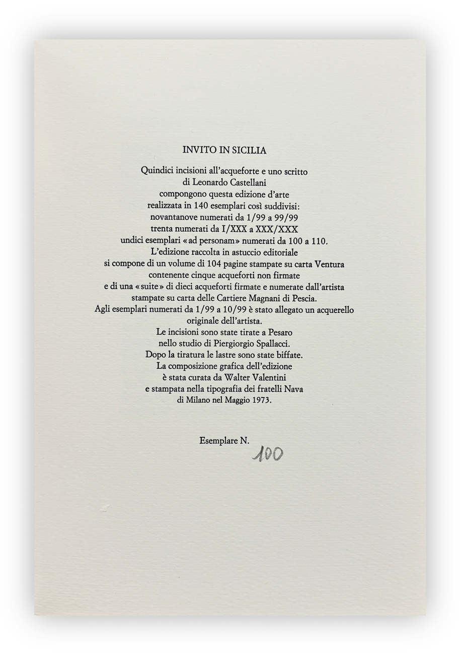 Edizione complessiva di 99 copie in numeri arabi, XXX copie in numeri romani e 11 copie ad personam numerate da 100 a 110