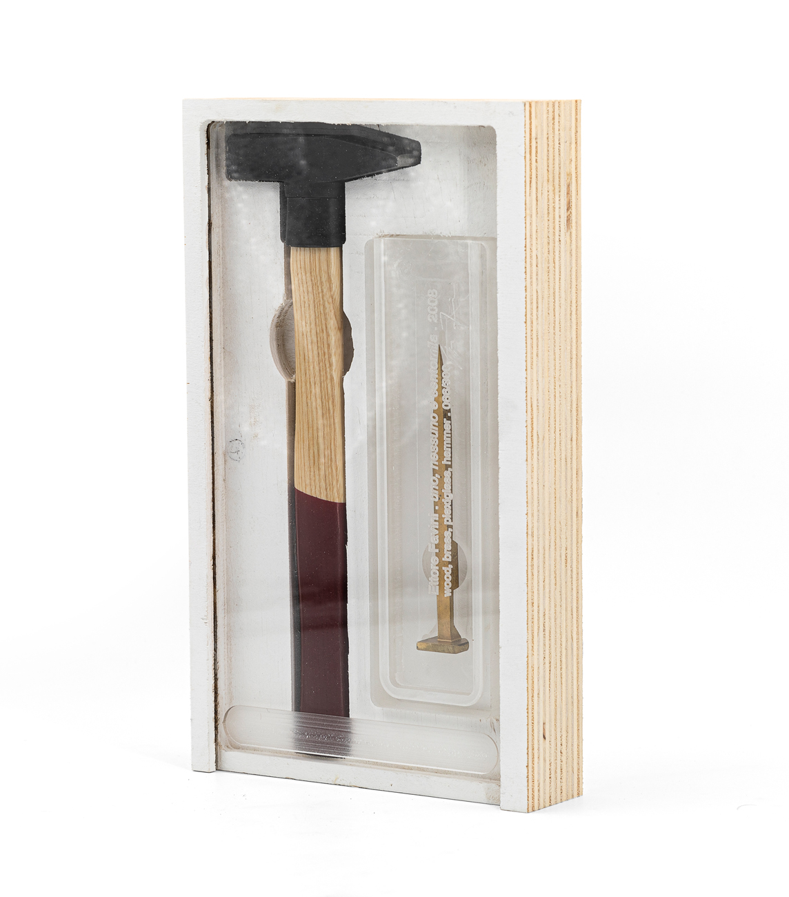 Multiplo composto da un martello ed un chiodo entro cassetta di legno con plexiglass