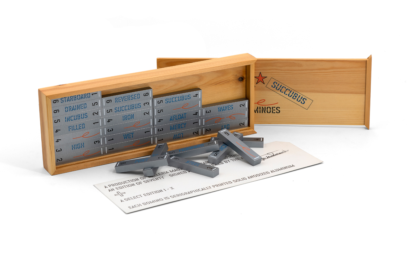 Multiplo costituito da 28 tasselli di Domino in alluminio anodizzato serigrafato contenuti in cassetta in legno di abete serigrafato