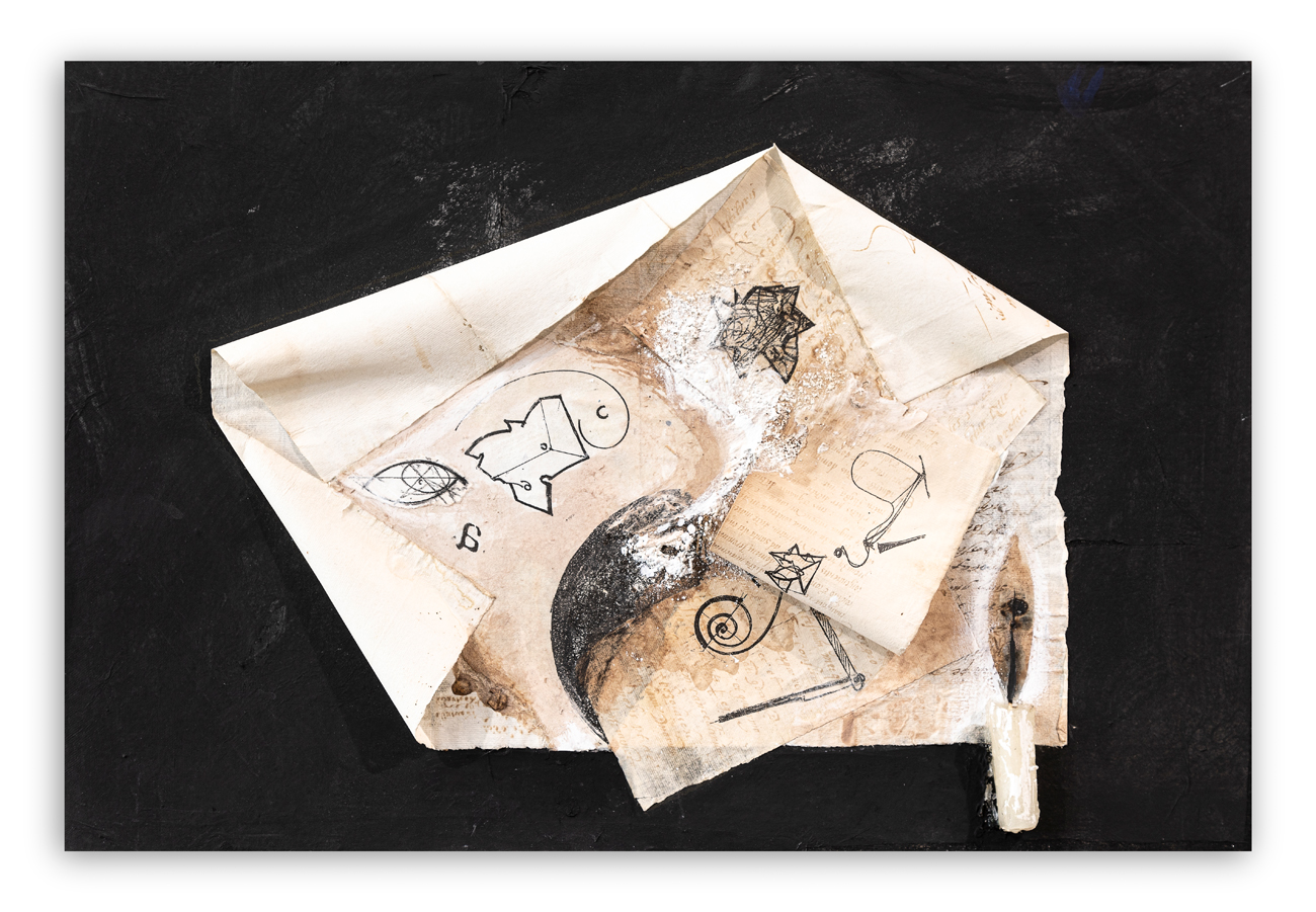 Assemblage (tecnica mista, collage di carte e cera) su tela dipinta e intavolata