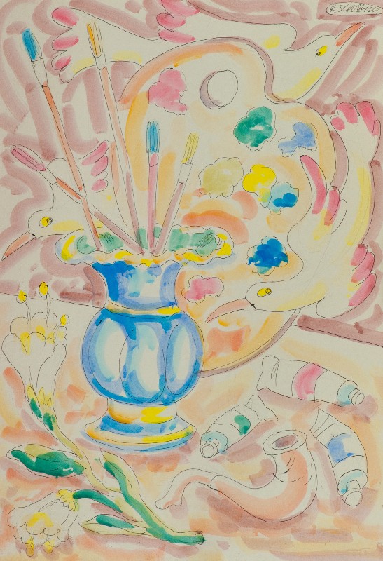 Roberto Sguanci (Firenze 1948) LOTTO UNICO DI DUE OPERE - "Natura morta e colombe", Gouache e china su carta, cm. 50x35, firmato in alto a destra, sul verso: firma, titolo e timbro "Casa d'Arte Nitti", Firenze; - "Maternità contadina", Gouache e china su carta, cm. 50x35, firmato in alto a sinistra, sul verso: firma, titolo e timbro "Casa d'Arte Nitti", Firenze.