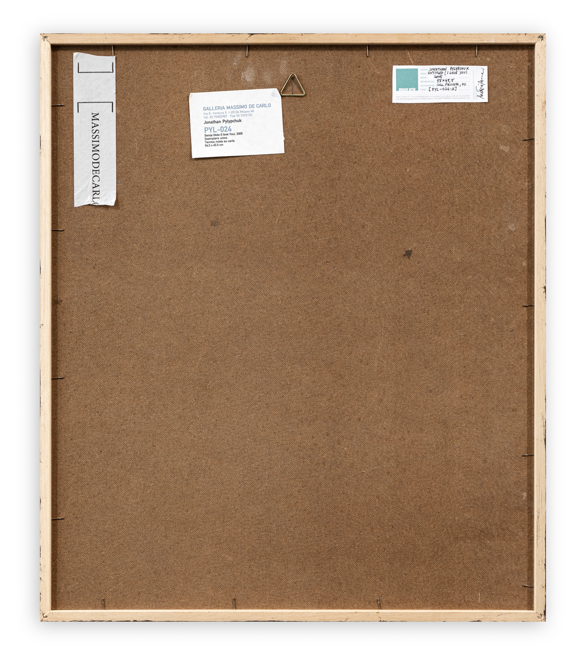 Etichetta della Galleria Massimo de Carlo (MI) caratteristiche tecniche dell'opera al retro della tavola protettiva