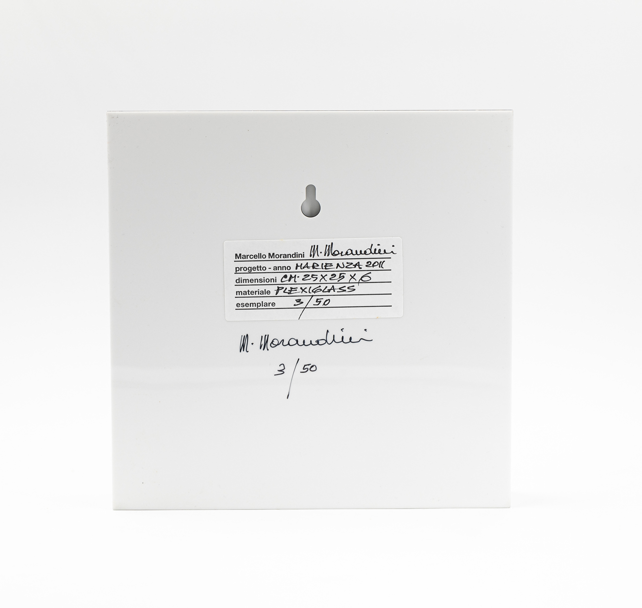Etichetta dell'Artista recante firma, caratteristiche tecniche dell'opera e numerazione (Esemplare 3/50) sotto la base