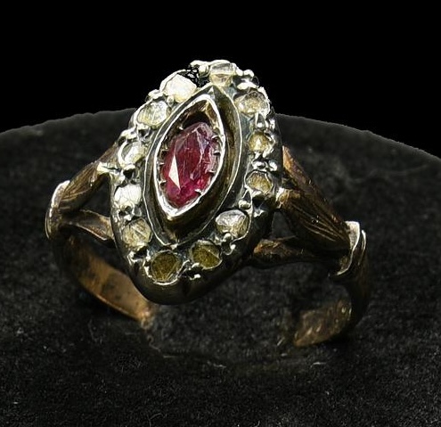 anello realizzato a losanga impreziosito da un rubino taglio navette con contorno di diamanti taglio a rosa