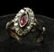 anello realizzato a losanga impreziosito da un rubino taglio navette con contorno di diamanti taglio a rosa
