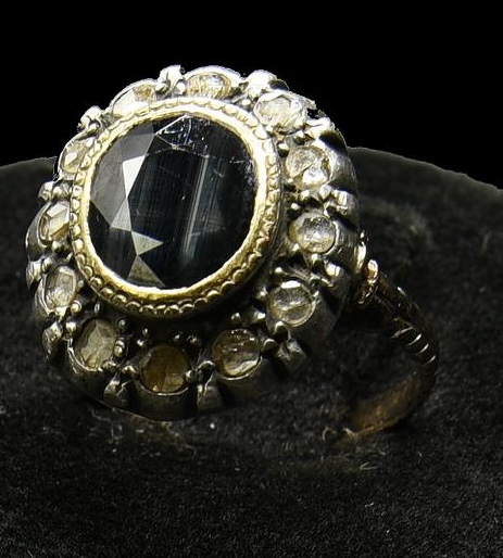 ANELLO IN ORO A BASSO TITOLO, ARGENTO, DIAMANTI E ZAFFIRO anello a corolla...