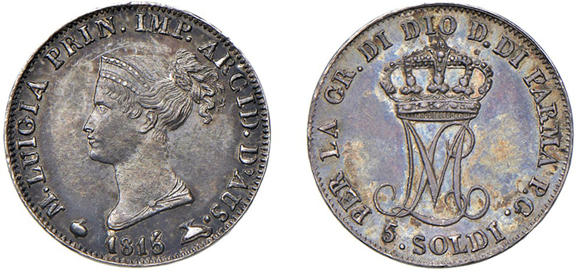 PARMA - MARIA LUIGIA (1815-1847) - 5 soldi 1815Argento - 1,23 gr.Dritto: Busto diademato a sinistra; - Rovescio: Grande Monogramma ML coronato.Gigante 12Bella patina di vecchia raccolta.m.SPL