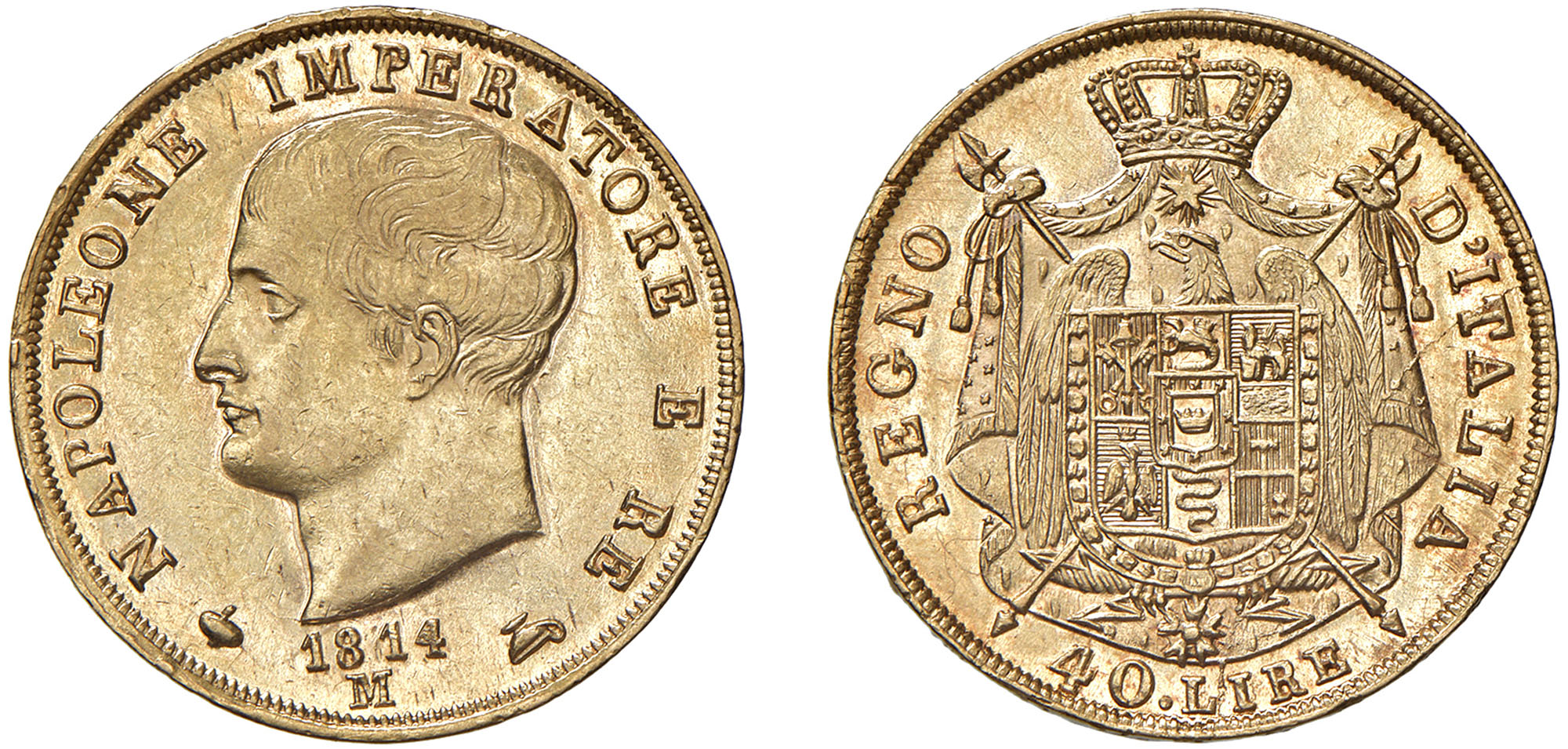 NAPOLEONE I, Re d'Italia (1805-1814) - 40 lire 1814, Milano, puntali sagomatiOro - 12,99 gr.Dritto: Testa nuda a sinistra. - Rovescio: stemma coronato su padiglione sorretto da alabarde decussate con puntali sagomati.Gigante 82Di inusuale conservazionem.SPL