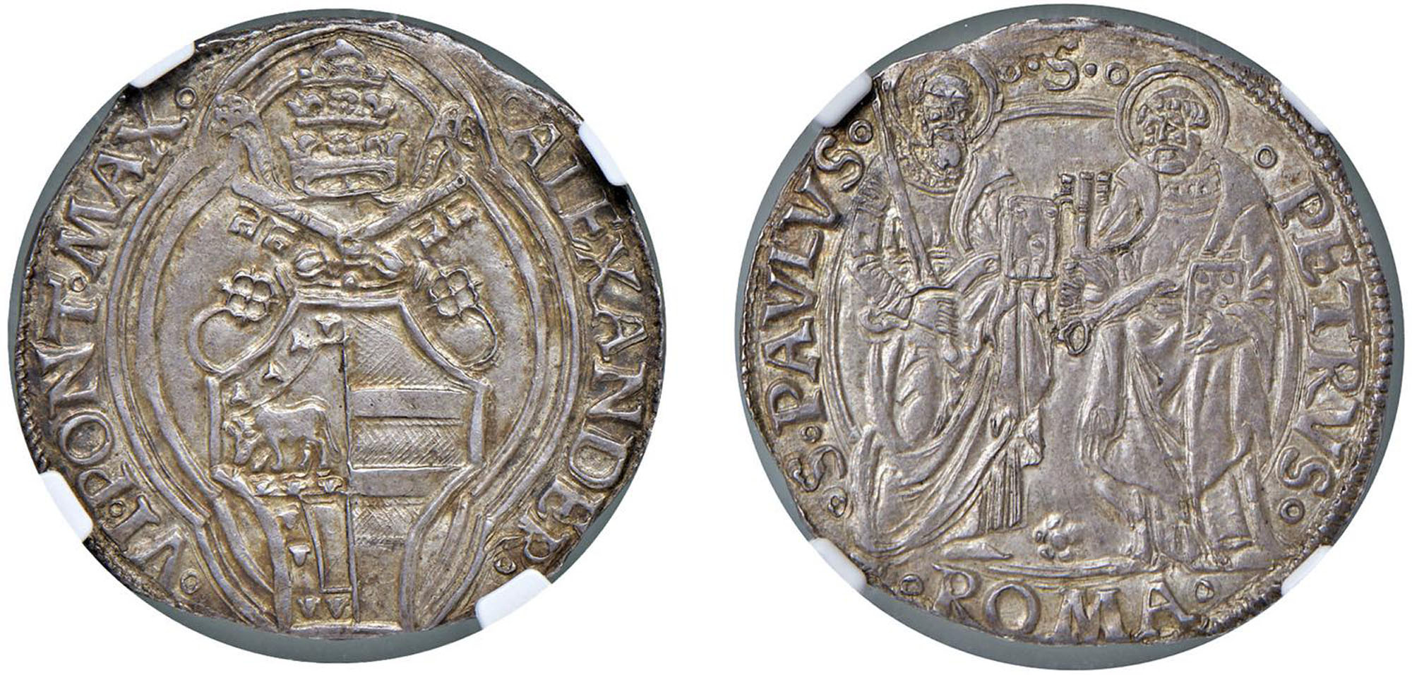 ALESSANDRO VI, Rodrigo De Borja (1492-1503) - Grosso s.d., RomaArgento - 3,29 gr. - diam. 27/28 mmDritto: Stemma ottagono sormontato da triregno e chiavi decussate, in quadrilobo. - Rovescio: Figure di San Pietro e San Paolo.Muntoni 16Bellissimo esemplare.Sigillato NGC MS63Certificato NGC n. 2791842-019Ex Nomisma 49 del 13 e 14 maggio 2014, lotto 1500 - SPL con la nota 'bellissimo esemplare dai nitidi rilievi e dalla bella patina'