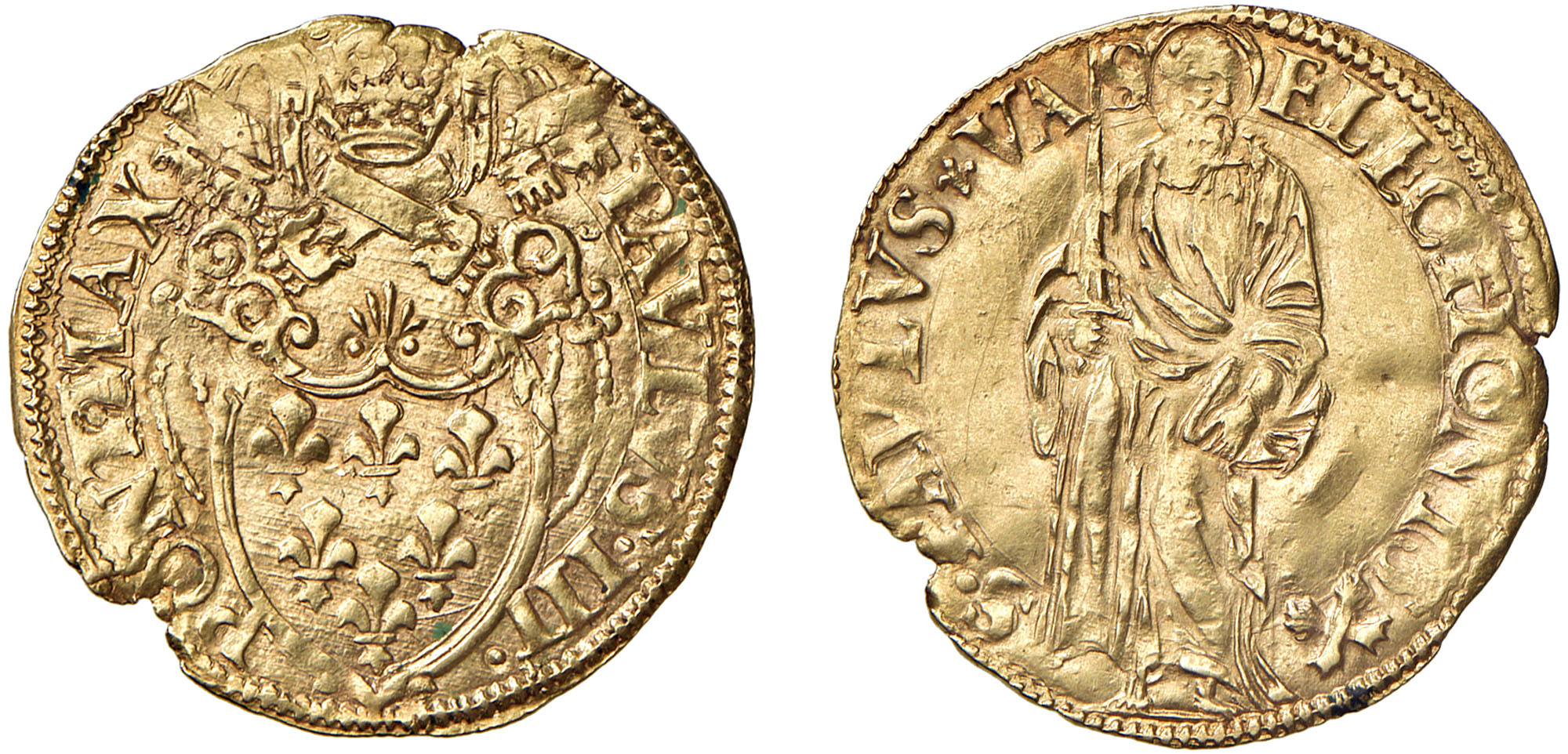 PAOLO III, Alessandro Farnese (1534-1549) - Scudo d'oro.Oro - 3,37 gr.Dritto: Stemma con cimasa a palmetta, sormontato da triregno e chiavi decussate. Rovescio: San Paolo stante di fronte con volto a destra, spada eretta e libro chiuso.Muntoni 23Modesti difetti di tondello e colpetto nel campo del /R.BB