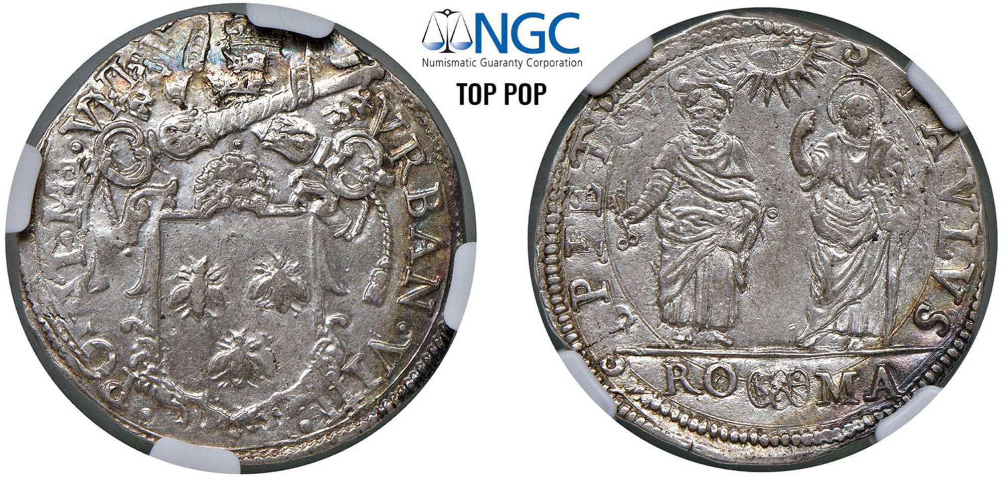 URBANO VIII, Maffeo Barberini (1623-1644) - Testone 1629, an. VI, RomaArgento - 9,72 gr.Dritto: Stemma a targa semiovale in cornice, cimasa leonina, sormontato da triregno e chiavi decussate. - Rovescio: Figure di San Pietro (con chiavi nella mano destra) e San Paolo (con spada).Muntoni 66Sigillato NGC AU58 - TOP POPCertificato NGC n. 2839716-009