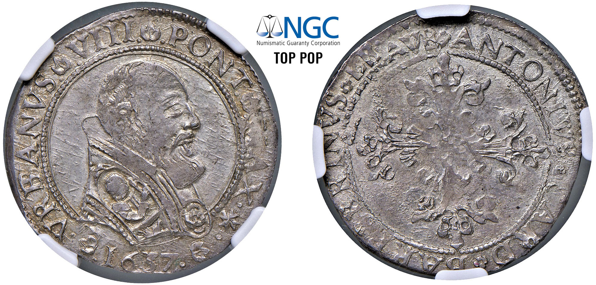 URBANO VIII, Maffeo Barberini (1623-1644) - Mezzo franco 1637, AvignoneArgento - 6,14 gr.Dritto: Busto a destra, piviale con busto di San Pietro: - Rovescio: Croce gigliata.Muntoni 214 RaroEsemplare di qualità inusuale.Sigillato NGC MS62 - TOP POPCertificato NGC n. 2824086-006