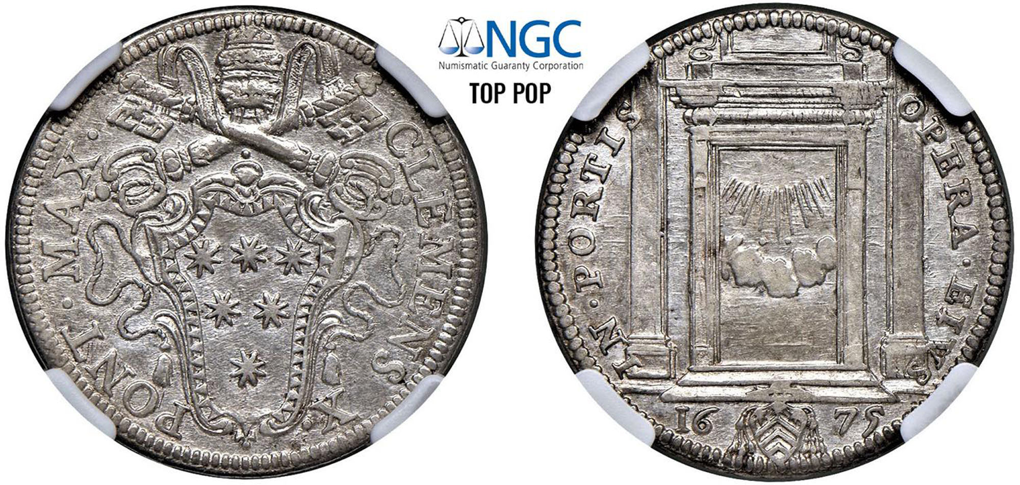 CLEMENTE X, Emilio Altieri (1670-1676) - Giulio 1675, RomaArgento - 3,24 gr.Dritto: Stemma oblungo, cimasa con volute, sormontato da triregno e chiavi decussate. - Rovescio: Porta santa aperta, nel vano: splendori.Muntoni 33Sigillato NGC AU58 - TOP POPCertificato NGC n. 2809905-014Ex Picena 1 del 14 giugno 2016, lotto 313 - SPL