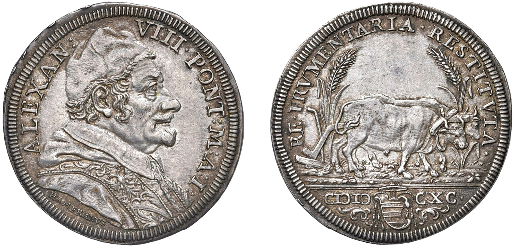 ALESSANDRO VIII, Pietro Ottoboni (1689-1691) - Testone, an. I, RomaArgento - 9,18 gr.Dritto: Busto a destra con camauro, stola con imprese araldiche. - Rovescio: Due buoi aranti a destra, tra spighe.Muntoni 16Bellissimo esemplare con delicata patina su fondi lucenti.Ottimo SPL-FDC