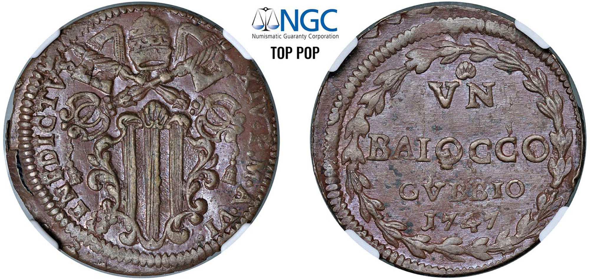BENEDETTO XIV, Prospero Lambertini (1740-1758) - Baiocco 1747, an. VI, GubbioRame - n.d.Dritto: Stemma a targa sagomata con fogliami, sormontato da triregno e chiavi decussate. Rovescio: Iscrizione in ghirlandaMuntoni 443aSigillato NGC MS62 BN - TOP POPCertificato n. 6141755-005Ex Aurora 23 del 9 ottobre 2021, lotto 72 - MS62 BN