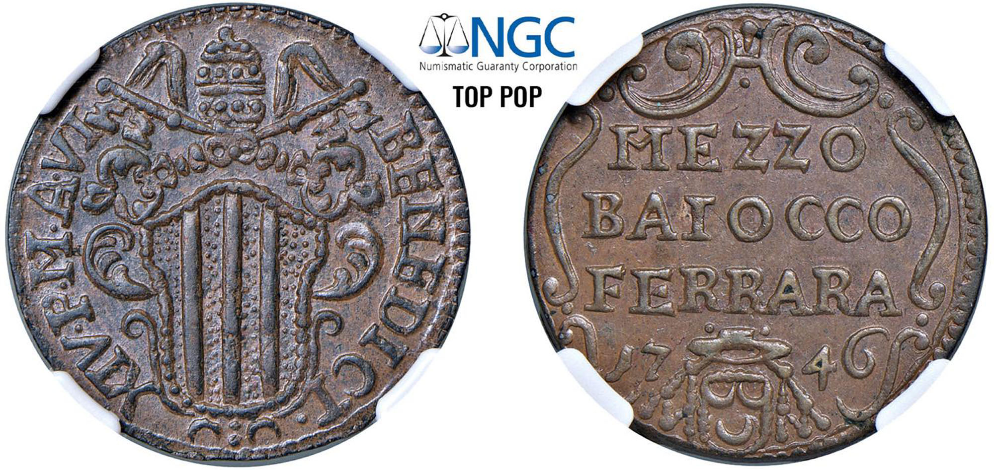 BENEDETTO XIV, Prospero Lambertini (1740-1758) - 1/2 baiocco 1746, an. VI, FerraraRame - n.d.Dritto: Stemma grande a targa semiovale con fogliame ai lati, sormontato da triregno e chiavi decussate. - Rovescio: Iscrizione in cartella chiusa in basso da stemma semiovale.Muntoni 281bConservazione inusualeSigillato NGC MS63 BN - TOP POPCertificato NGC n. 6141756-001Ex Aurora 23 del 9 ottobre 2021, lotto 40 - MS63 BN
