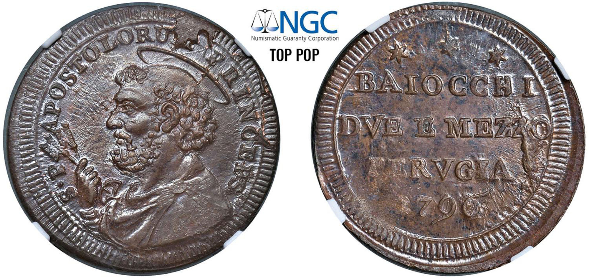 PIO VI, Giovanni Angelo Braschi (1775 - 1799) - Sampietrino da 2 e 1/2 baiocchi, 1796, PerugiaRame - 16,79 gr.Dritto: Busto dell'apostolo Pietro a sinistra con le chiavi in mano. - Rovescio: in alto tre stelle a sei raggi (stelle grandi). Scritta in 4 righe.Muntoni 393 Molto raroSigillato NGC MS63 BN - TOP POPCertificato NGC n. 2806454-011Ex Ranieri 9 del 22 maggio 2016, lotto 800 - SPL