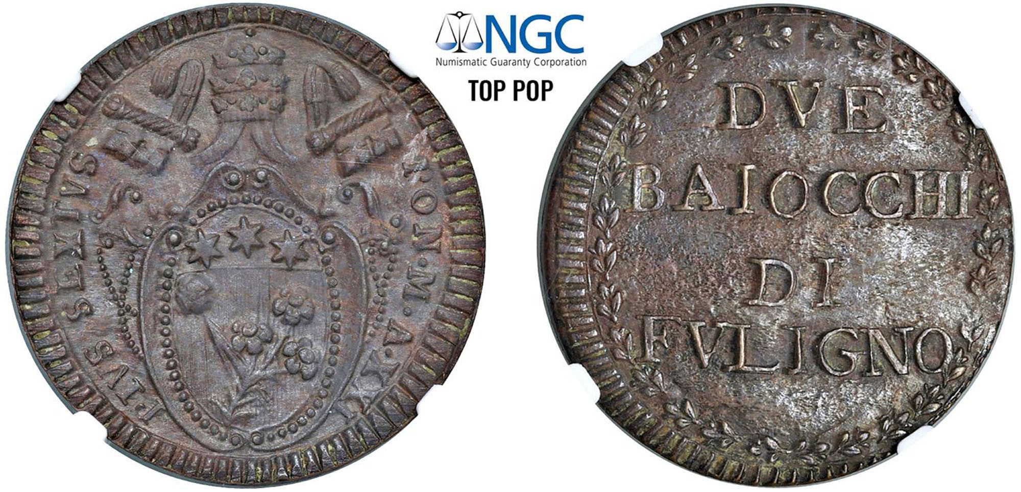 PIO VI, Giovanni Angelo Braschi (1775-1799) - 2 Baiocchi 1796, an. XXI, FolignoRame - n.d.Dritto: Stemma ovale in cornice, cimasa a volute, sormontato da triregno e chiavi decussate. - Rovescio: Iscrizione in corona di fogliette trinate con bacche.Muntoni 339Sigillato NGC MS63 BN - TOP POPCertificato NGC n. 2806454-008