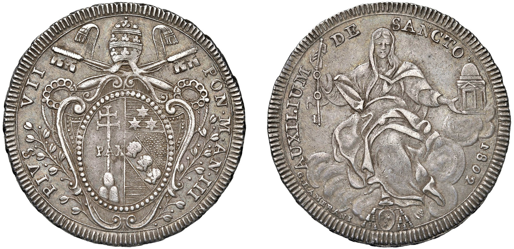 PIO VII, Gregorio Luigi Barnaba Chiaramonti (1800-1823) - Scudo 1802, an. III, Roma, II tipoArgento - 26,38 gr.Dritto: Stemma sormontato da triregno e chiavi decussate; - Rovescio: La Chiesa, seduta tra le nubi, con chiavi e tempio.Gigante 22b RaroVariante con al /R 'AUXILIUM'.BB-SPL