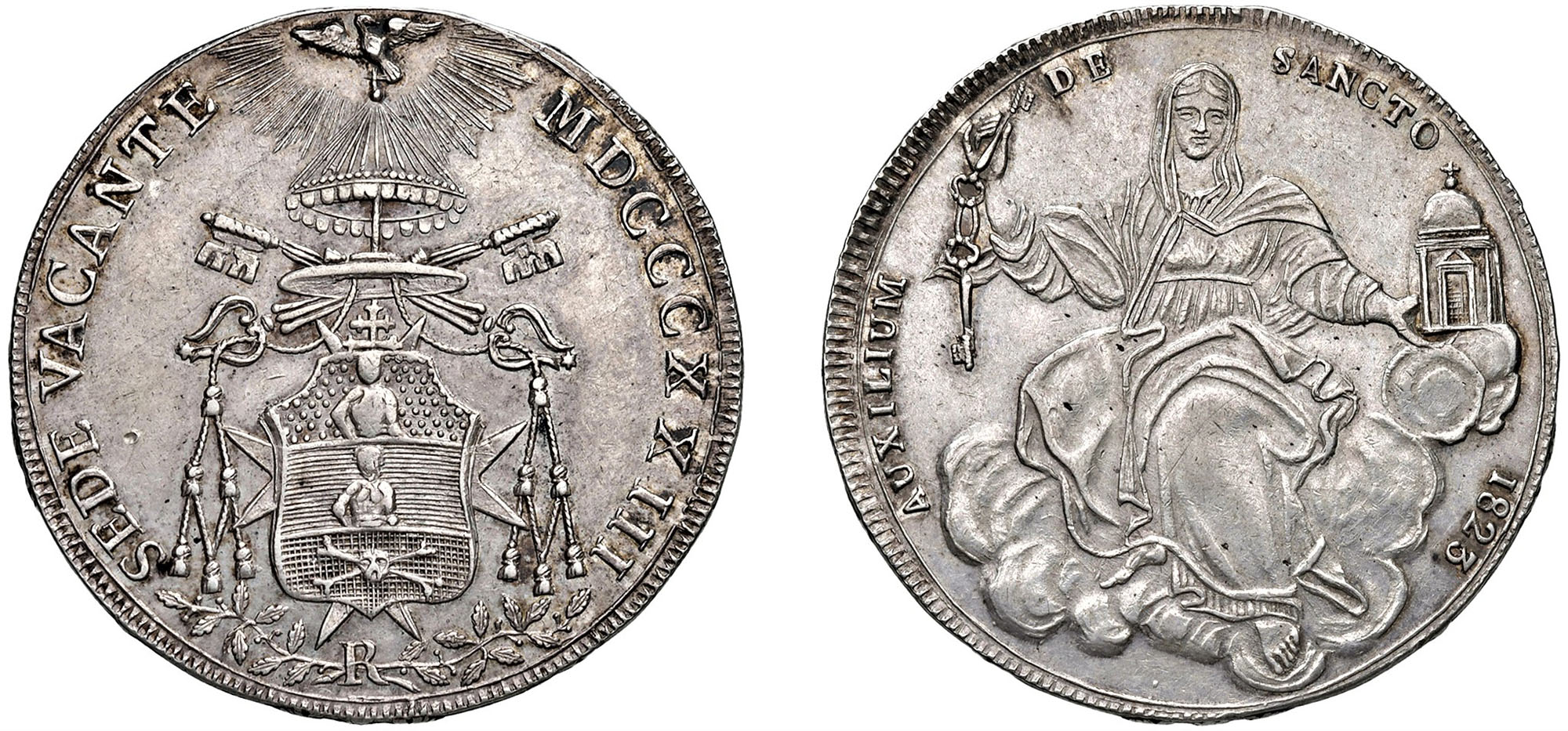 SEDE VACANTE, Card. Bartolomeo Pacca (1823) - Scudo 1823, Roma, I tipoArgento - 26,42 gr.Dritto: Stemma, su croce di Malta, sormontato da galero, chiavi decussate, padiglione e colomba raggiante; - Rovescio: La Chiesa, seduta tra le nubi, con chiavi e tempio.Gigante 3 RarissimoGradevole esemplare per questo raro millesimo.SPL