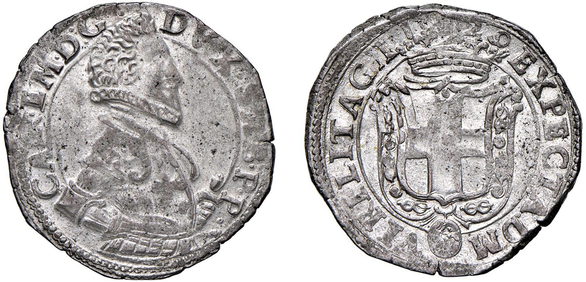 CARLO EMANUELE I (1580-1630) - Fiorino 1629, III tipo, TorinoArgento/Mistura - 4,34 gr.Dritto: Busto completo del duca, corazzato, rivolto a destra, con mano destra sul guardastanza del petto della corazza e mano sinistra impugnante la spada; - Rovescio: Scudo sabaudo con corona di 5 fioroni, con attorno il Collare dell'Annunziata.Cudazzo 746b RaroUsuali debolezze di conio, altrimentiSPL