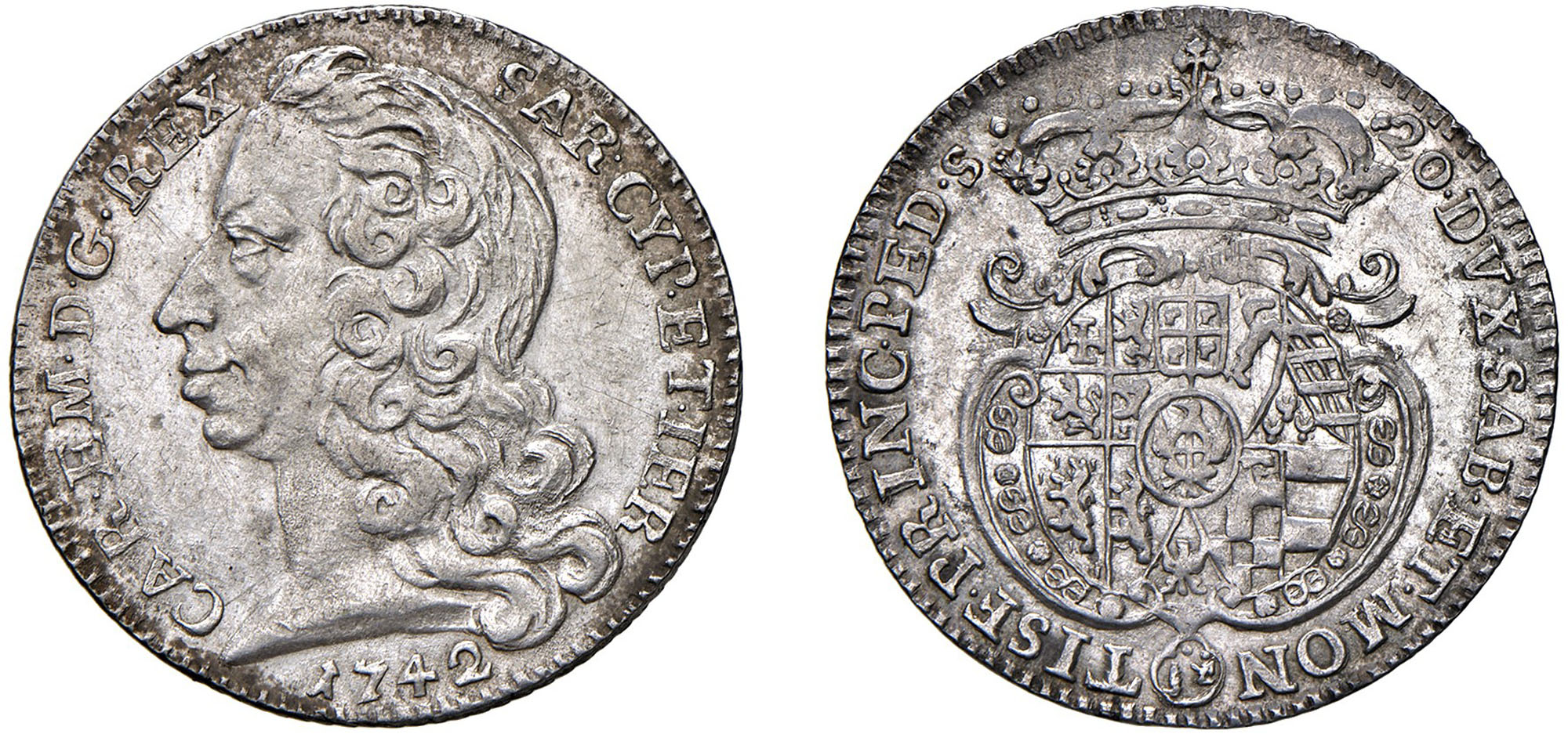 CARLO EMANUELE III, primo periodo (1730-1755) - Lira 1742, TorinoArgento - 5,57 gr.Dritto: Testa nuda a sinistra. - Rovescio: Scudo sabaudo a cartoccio, inquadrato e coronato, con intorno Collare dell'Annunziata.Cudazzo 1040 RaraTipologia difficilmente reperibile in questa qualità. Lievi graffietti.m.SPL