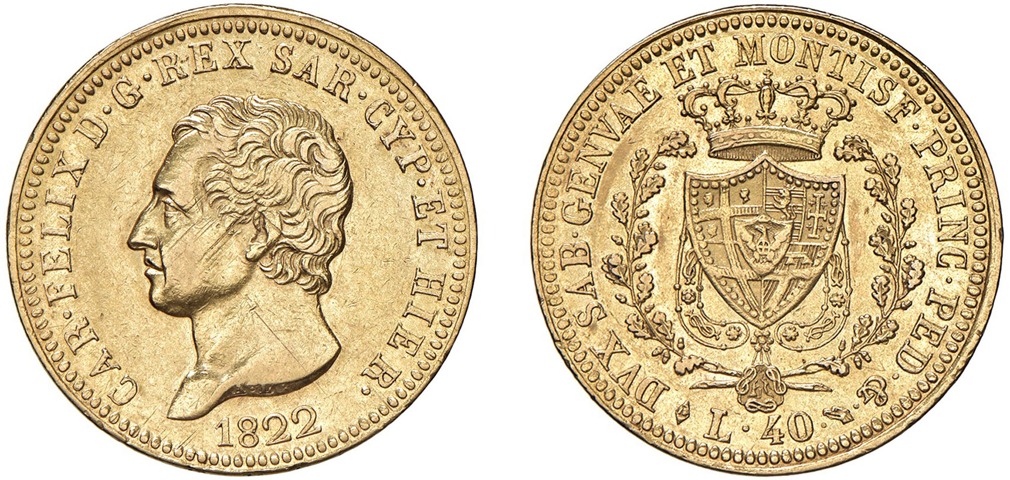 CARLO FELICE (1821-1831) - 40 lire 1822, TorinoOro - 12,89 gr.Dritto: Testa nuda a sinistra, nel taglio del collo A. L.; - Rovescio: Scudo a cuore coronato ed inquadrato, con il Collare dell'Annunziata, tra due rami di quercia.Gigante 15 - Molto raroSigillata q.SPL/SPL+ dal perito NIP Cavaliere Francesco