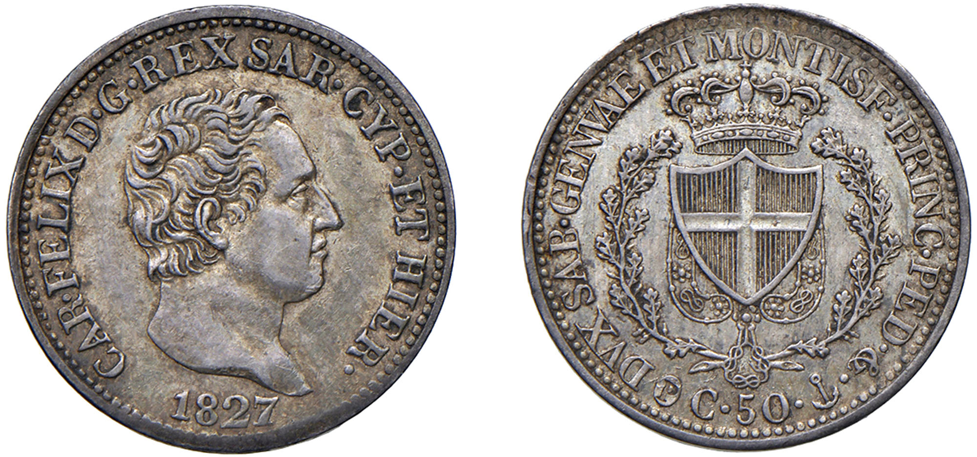 CARLO FELICE (1821-1831) - 50 centesimi 1827, GenovaArgento - 2,51 gr.Dritto: testa nuda a destra, nel taglio del collo A. L. (Amedeo Lavy, incisore) - Rovescio: Scudo sabaudo crociato e coronato, con il Collare dell'Annunziata, tra due rami di quercia.Gigante 90Bella patina di vecchia raccolta.m.SPL