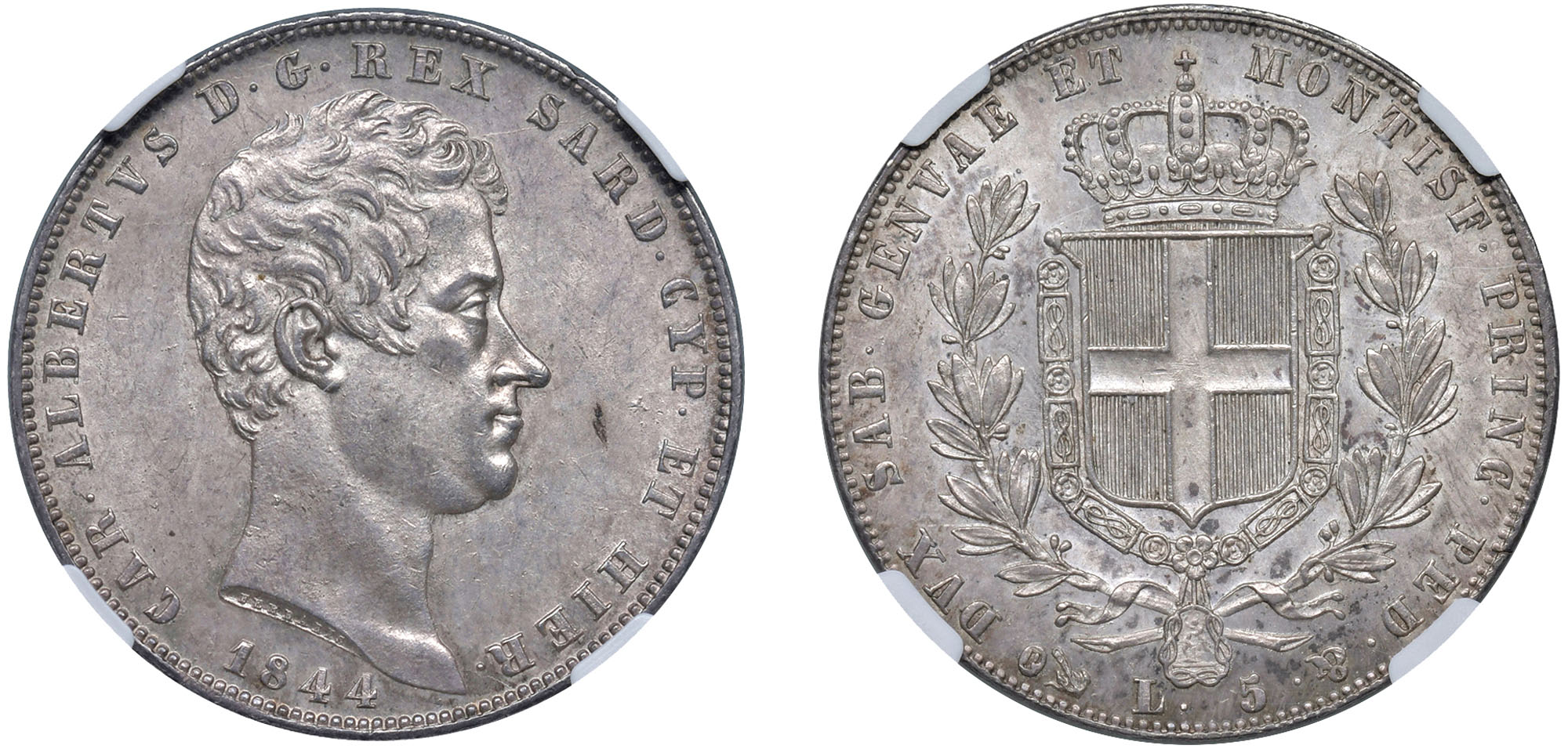 CARLO ALBERTO (1831-1849) - 5 lire 1844, GenovaArgento - 24,98 gr.Dritto: Testa nuda a destra, nel taglio del collo FERRARIS. - Rovescio: Stemma crociato e coronato, con il Collare dell'Annunziata, tra due rami di lauro.Gigante 79Bell'esemplare con patina di vecchia raccolta.Sigillato NGC MS62Certificato NGC n. 5776393-006