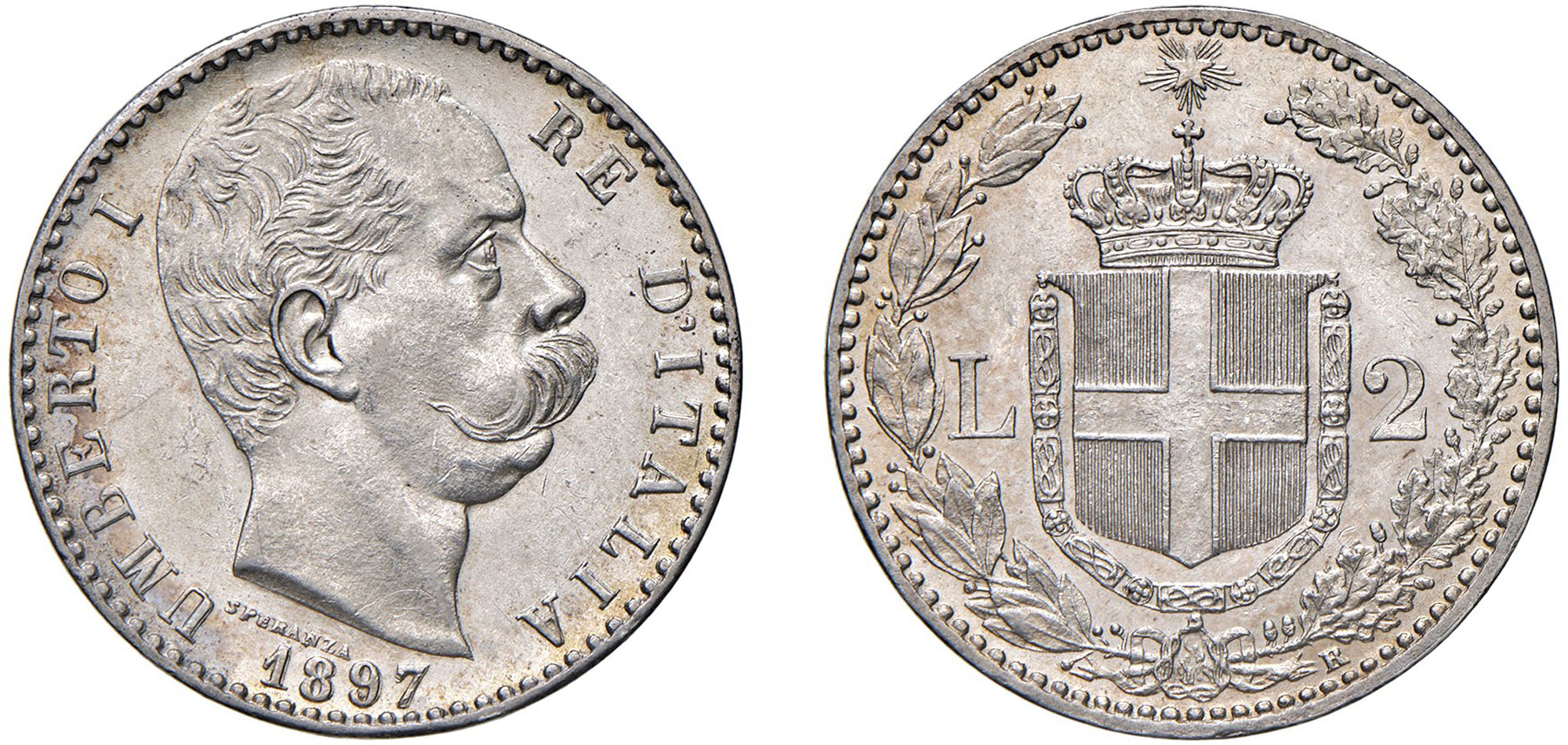 UMBERTO I (1878-1900) - 2 lire 1897Argento - 10,00 gr.Dritto: Testa nuda a destra, sotto il collo SPERANZA; - Rovescio: Stemma crociato e coronato, con il Collare dell'Annunziata, tutto tra rami di lauro e di quercia; in alto stella raggiante.Gigante 32Bell'esemplare.q.FDC