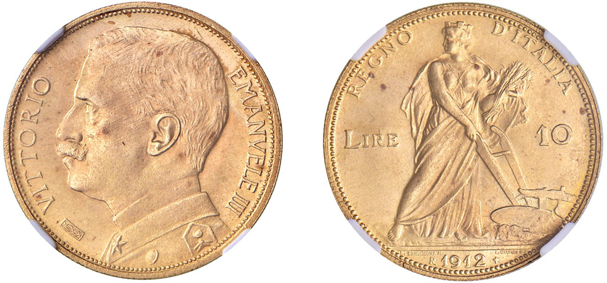 VITTORIO EMANUELE III (1900-1943) - 10 lire 1912Oro - n.d.Dirtto: Semibusto a sinistra in uniforme; - Rovescio: L'Italia aratrice con aratro e spighe.Gigante 52 RarissimoEsemplare di notevole qualità.Sigillato NGC MS64Certificato NGC n. 6640187-002