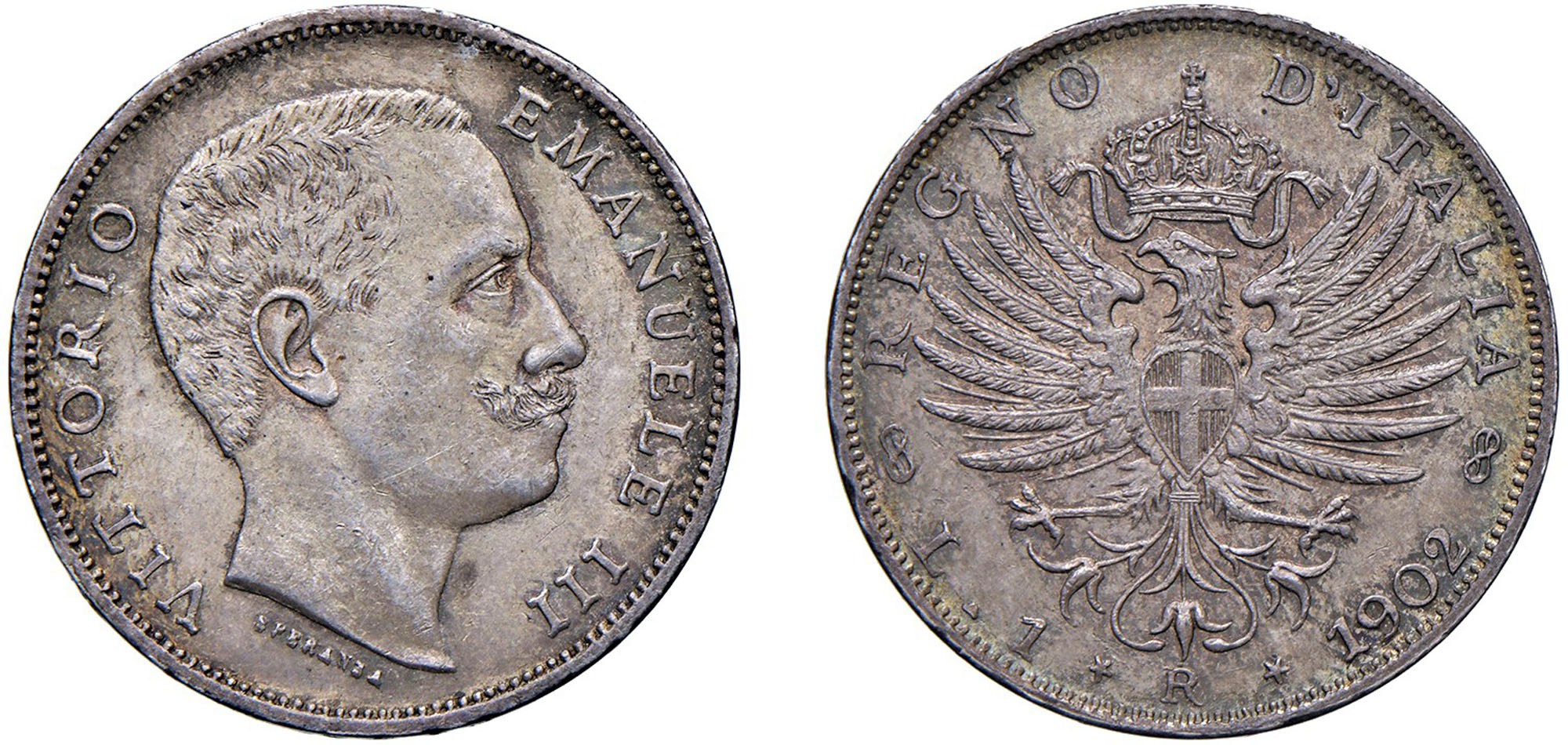 VITTORIO EMANUELE III (1900-1943) - 1 lira 1902Argento - 5,01 gr.Dritto: Testa nuda a destra, sotto al collo SPERANZA; - Rovescio: Aquila coronata ad ali spiegate con scudo sabaudo e cuore caricato in petto.Gigante 128Bellissima patina di vecchia raccolta.praticamente FDC
