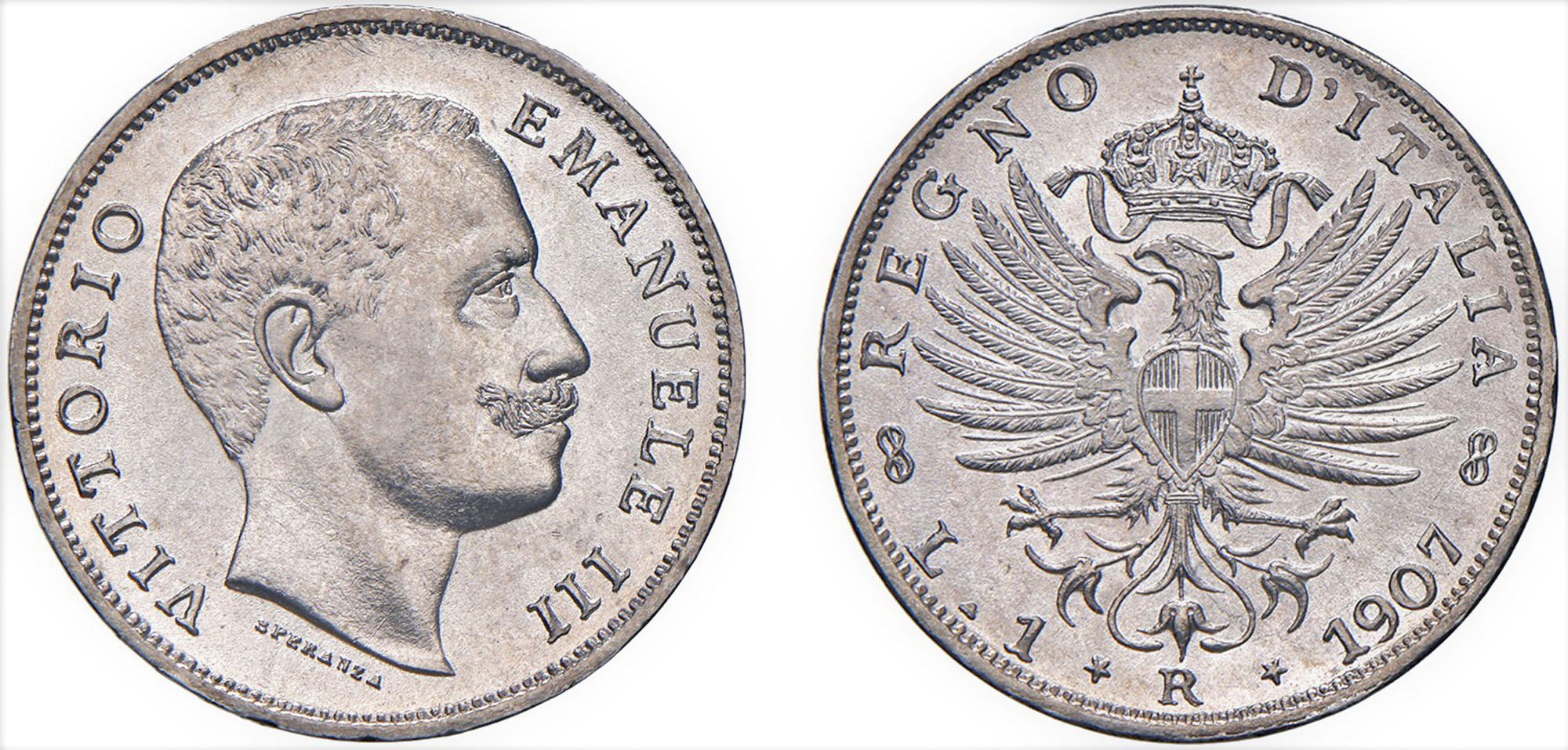 VITTORIO EMANUELE III (1900-1943) - 1 lira 1907Argento - 5,00 gr.Dritto: Testa nuda a destra, sotto al collo SPERANZA; - Rovescio: Aquila coronata ad ali spiegate con scudo sabaudo e cuore caricato in petto.Gigante 131praticamente FDC