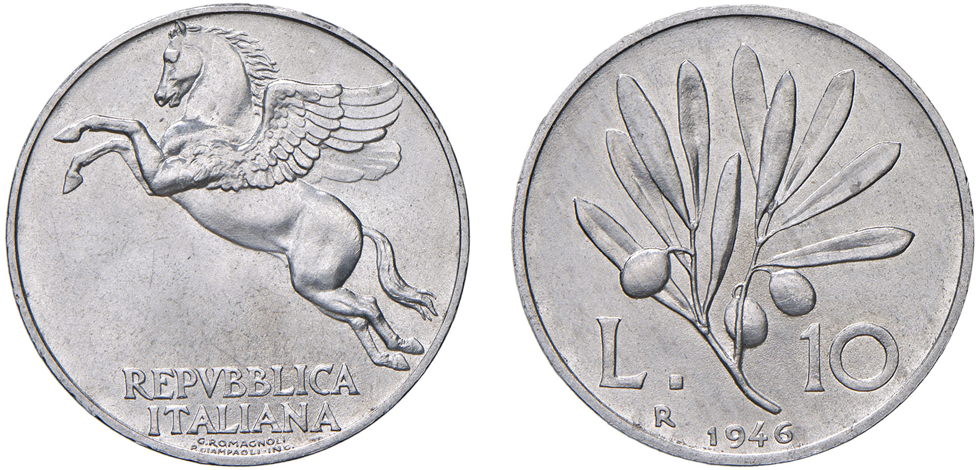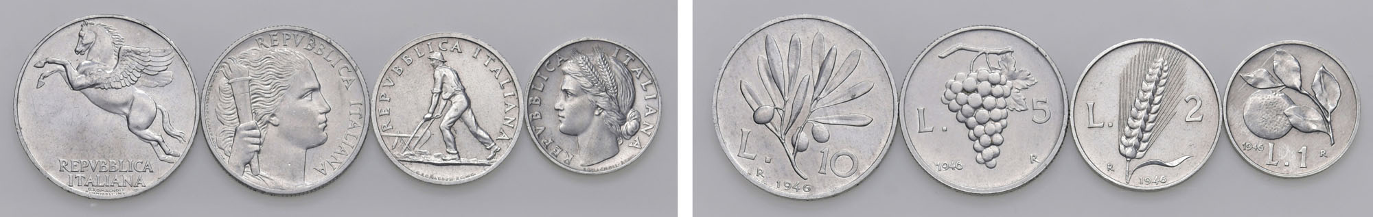 REPUBBLICA ITALIANA (1946-) - Serie di 4 valori anno 1946Italma - 8,49 gr.Gigante 229 (Raro), 277 (Molto raro), 324 (Raro), 361 (Raro)Segnaliamo l'esemplare da 10 lire in conservazione q.FDC. Graffi di pulizia e punti di ossidazione sull'esemplare da 5 lire.Varie conservazioni da BB-SPL a q.FDCDa esaminare.
