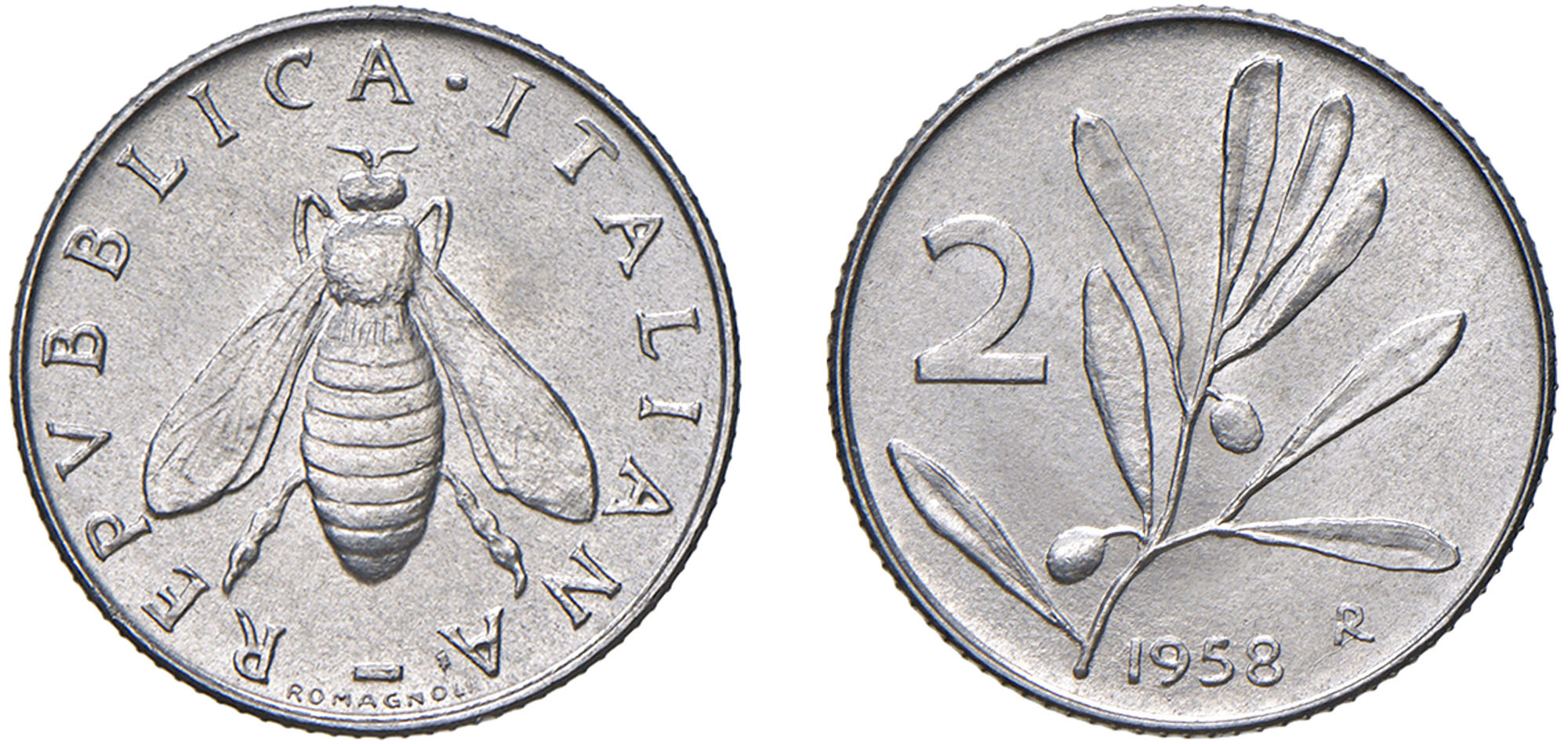 REPUBBLICA ITALIANA (1946-) - 2 lire 1958Italma - 0,80 gr.Dritto: Ape; - Rovescio: Ramo d'ulivo.Gigante 92 Molto raroDi eccezionale conservazioneFDC