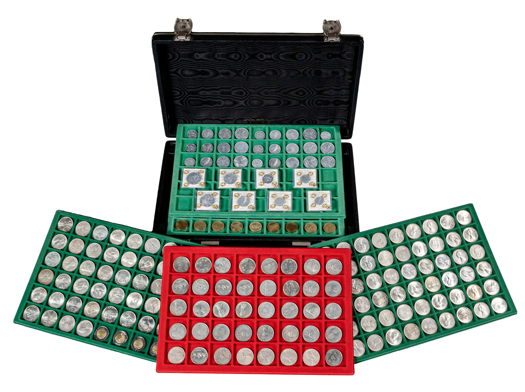 REPUBBLICA ITALIANA (1946-) - Interessante collezione pressoché completa, con numerosi doppioni di 541 monete (di cui 145 esemplari da 500 lire in argento).Vari metalli di cui Argento 1598,60 gr - Peso totale di 4 kg cricaRaccolta molto avanzata (manca la serie 1947), contenente numerosissimi doppioni. Segnaliamo la presenza delle seguenti monete:10 lire 1946 (Gigante 229, Raro) sigillato SPL-FDC/SPL+ da Perito NIP10 lire 1946 (Gigante 229, Raro) sigillato SPL-FDC/SPL da Perito NIP5 lire 1946 (Gigante 277, Molto raro) sigillato MB da Perito NIP2 lire 1946 (Gigante 324, Raro) sigillato q.SPL da Perito NIP1 lira 1946 (Gigante 361, Raro) sigillato q.FDC da Perito NIP5 lire 1956 (Gigante 287, Raro) sigillato BB da Perito NIP5 lire 1956 (Gigante 287, Raro) Sigillato MB da Perito NIP2 lire 1958 (Gigante 334, Molto raro) sigillato BB-SPL da Perito NIP145 esemplari di 500 lire in argento (Vari in FDC), e 1 1000 lire 1970 (FDC).Conservazioni mediamente alte, da MB a FDCDa esaminare.