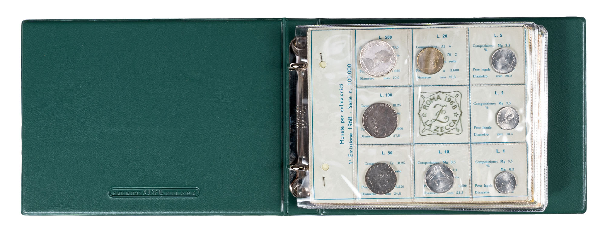 REPUBBLICA ITALIANA (1946-) - Raccoglitore contenete 17 divisionali dal 1968 al 1984Vari metalli, di cui Argento - 91,60 gr.Divisionali in confezioni Abafil e zeccaFDCDa esaminare.