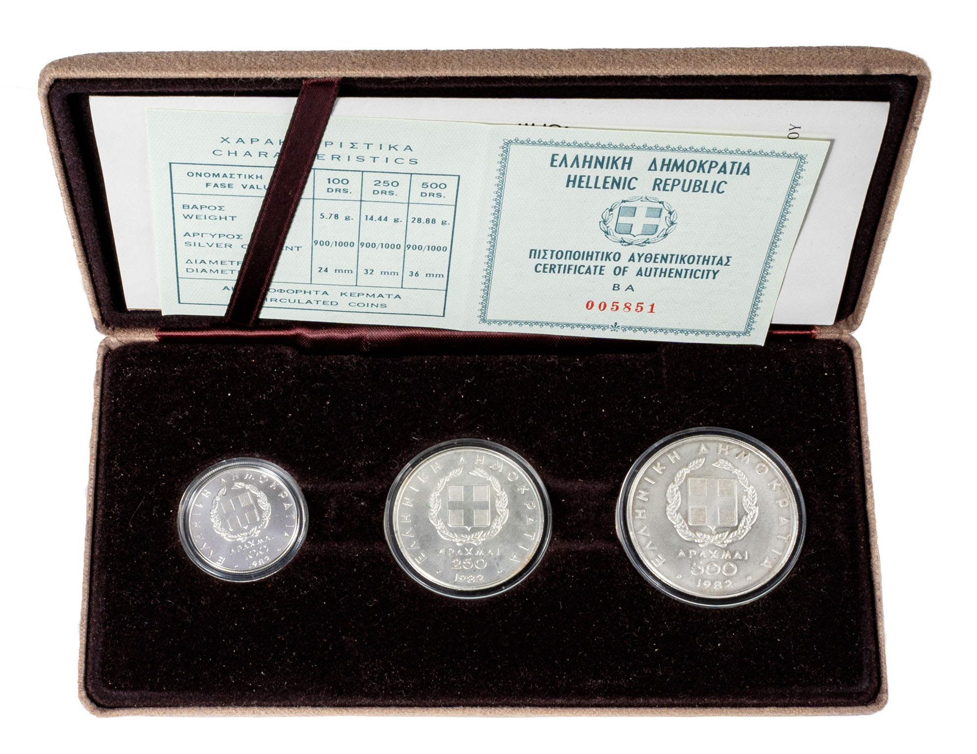 GRECIA - Set di 3 monete, 1986Argento - 49,1 gr.Set dedicato ai XIII Campionati europei di atletica leggera di Atene 1986, in cofanetto originale, con certificato.FDC