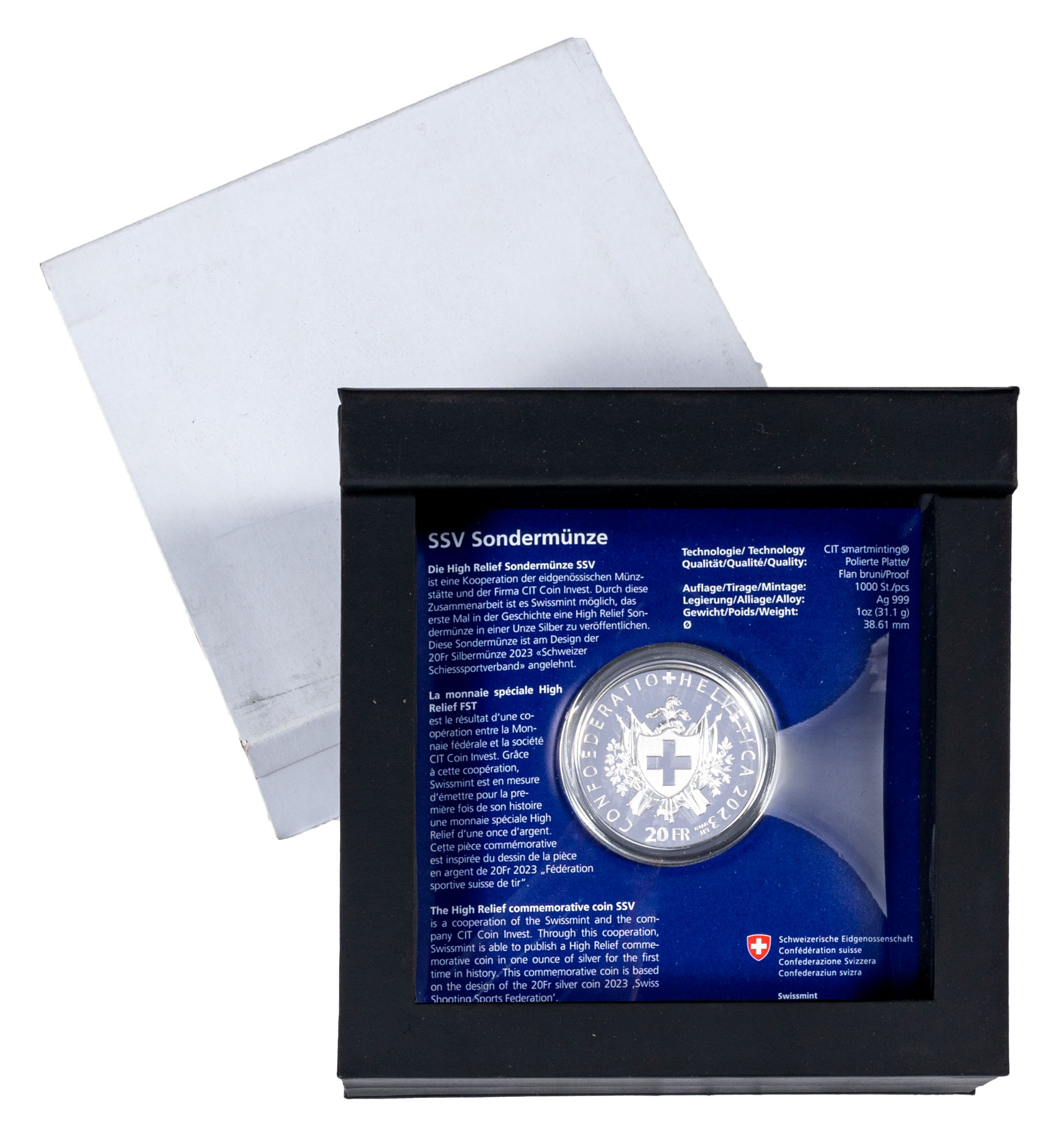 SVIZZERA - 20 franchi 2023, edizione limitata in altorilievoArgento - 31,10 gr.Esemplare in edizione limitata per il 200° anniversario della SSV (1824-2024).Solo 1000 esemplari coniati, in astuccio originale numerato.Questo esemplare è il numero 880.FDC/FS