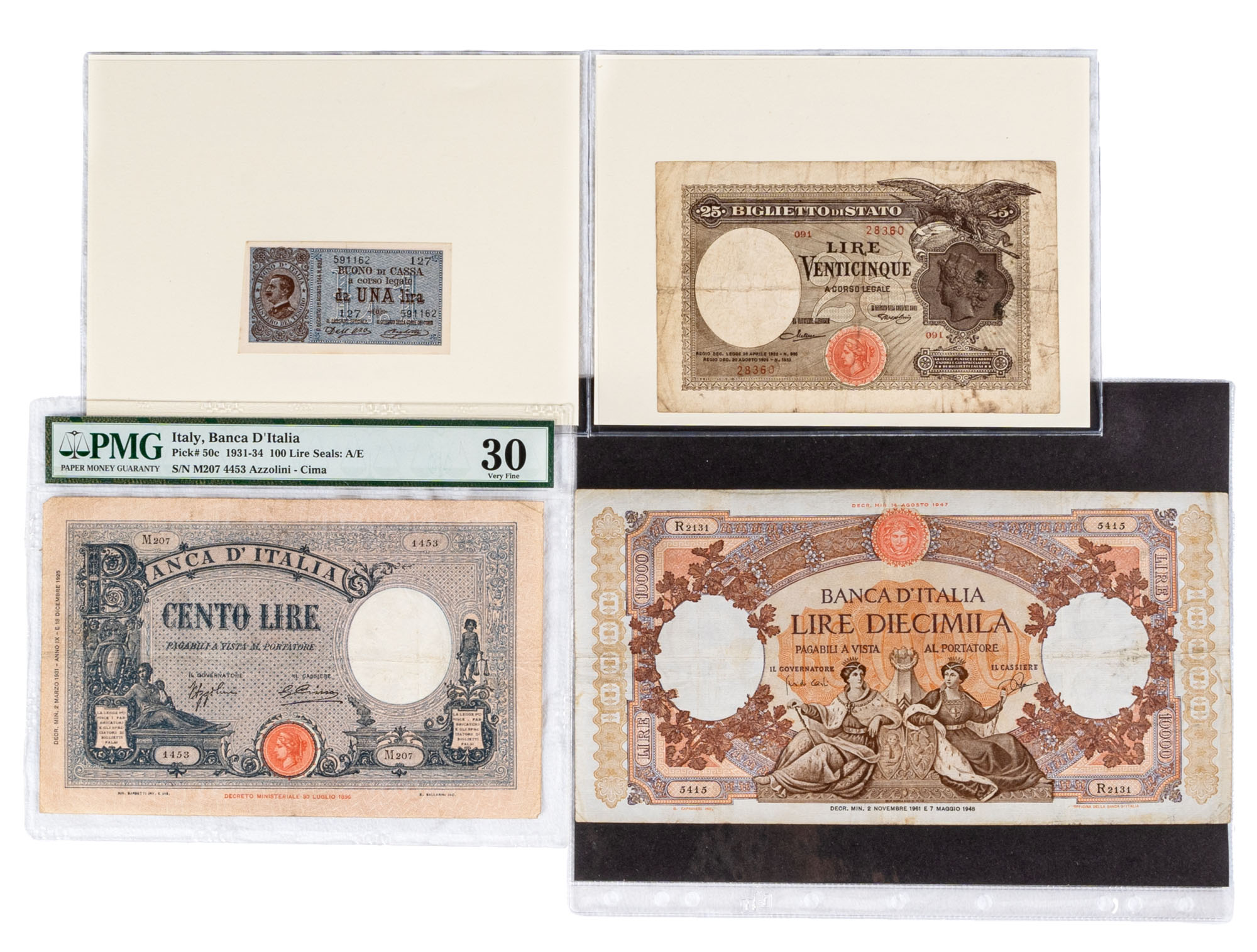 REGNO D'ITALIA E REPUBBLICA ITALIANA - CARTAMONETA - Lotto di 4 banconoteVarie raritàVarie conservazioniSi segnala la presenza di:VITTORIO EMANUELE III (1900-1943) - Banca d'Italia, 100 lire - Emissione o Decreto 02/03/1931 - Certificato VF30 da PMG (Certificato n. 1619888-018)- VITTORIO EMANUELE III (1900-1943) - Buono di cassa da 1 lira - Emissione o Decreto 21/09/1914 - Certificato FDC dal Perito NIP Grimoldi FabioVITTORIO EMANUELE III (1900-1943) - Biglietto di Stato da 25 lire - Emissione o Decreto 20/09/1923, Rarissimo - Certificato BB+ dal Perito NIP Grimoldi FabioDa esaminare.