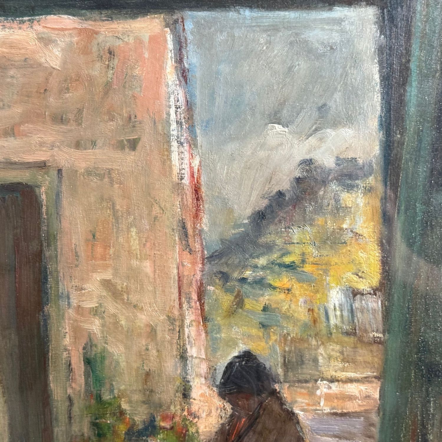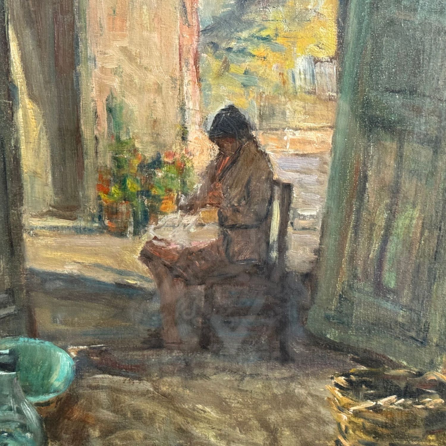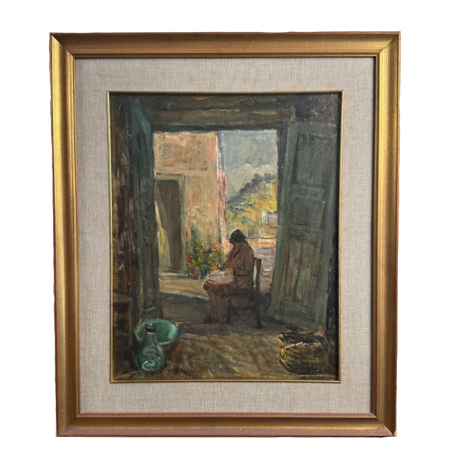 Dipinto olio su pannello, periodo XX secolo scuola Italiana, raffigurante Ritratto di donna seduta in un interno.