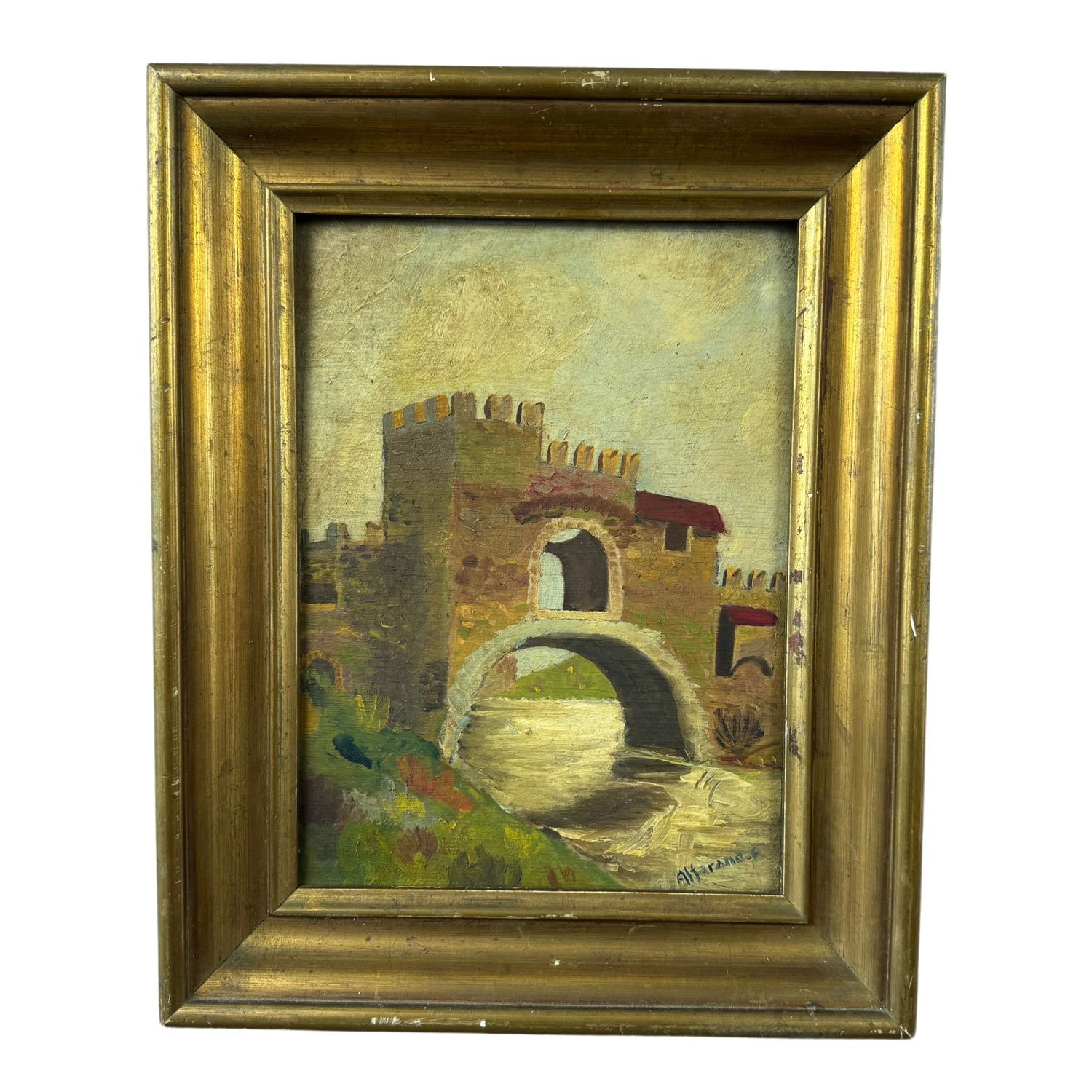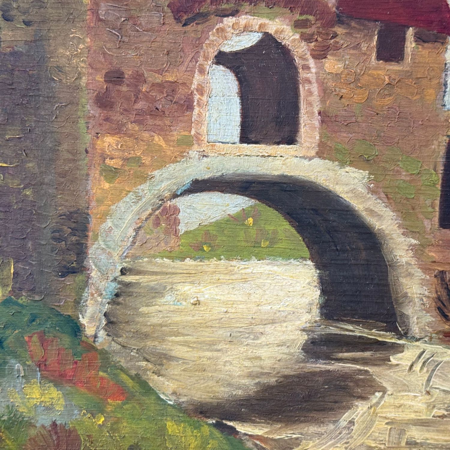 Dipinto olio su tavola, periodo XX secolo scuola Italiana, raffigurante Fiume con ponte (Luogo imprecisato)