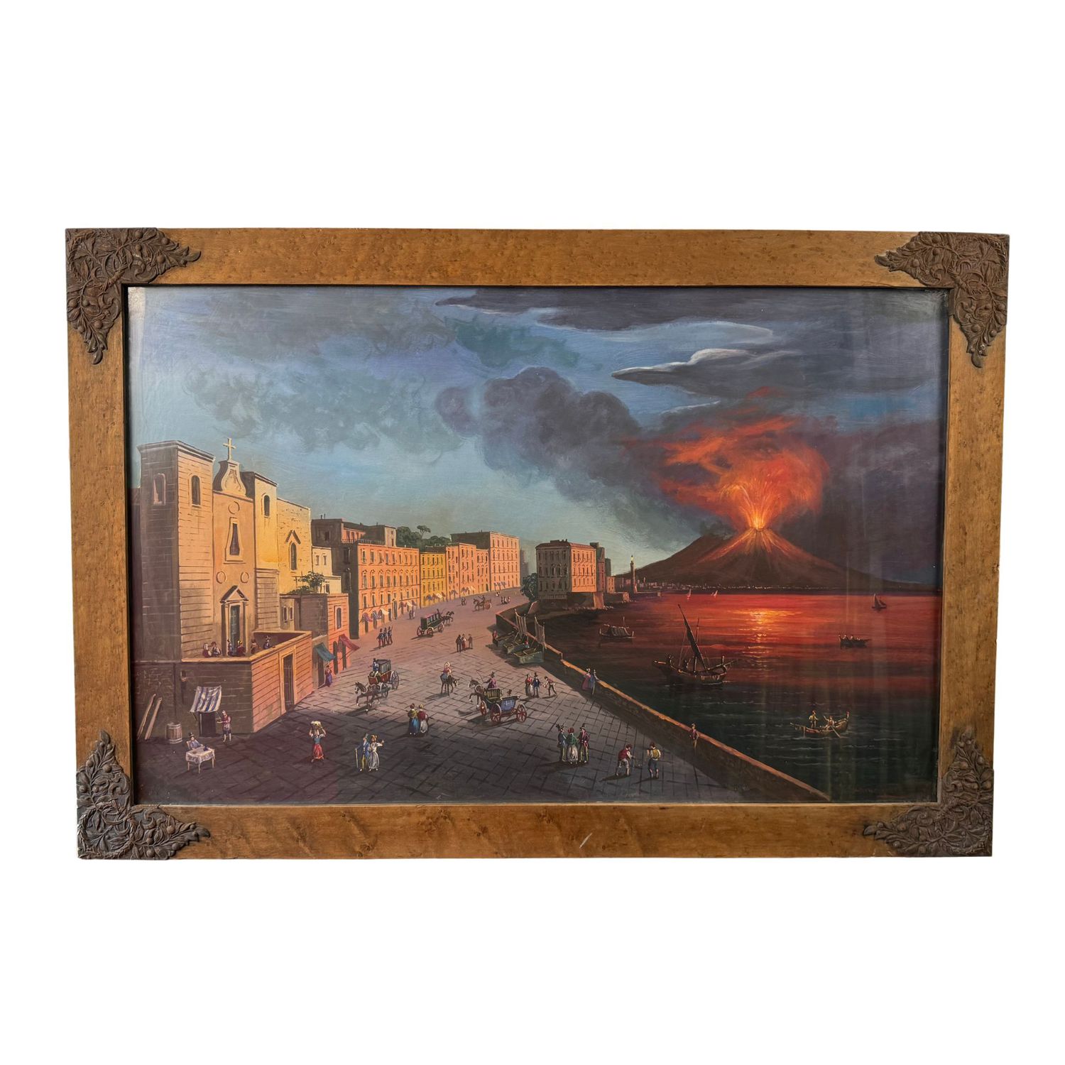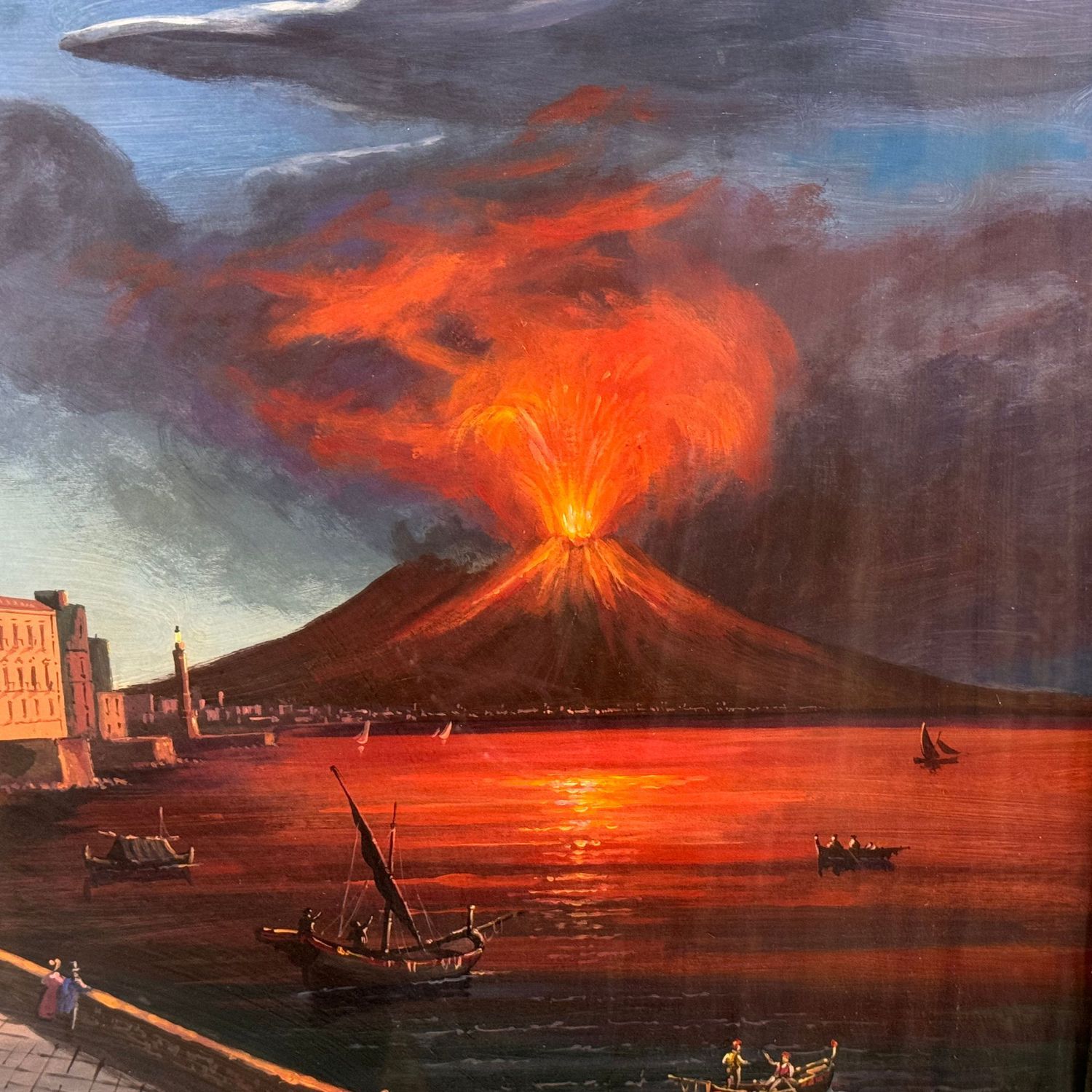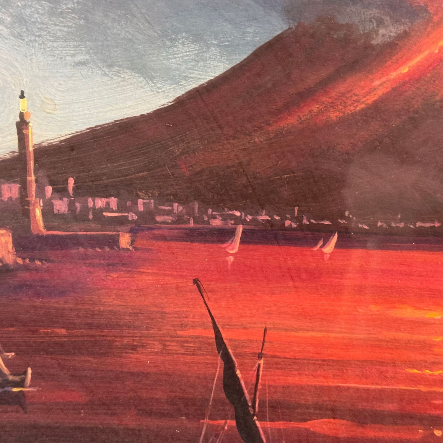 Dipinto guazzo (tempera su cartoncino), periodo inizio XX secolo scuola Italiana, raffigurante Eruzione del Vesuvio vista da Santa Lucia.