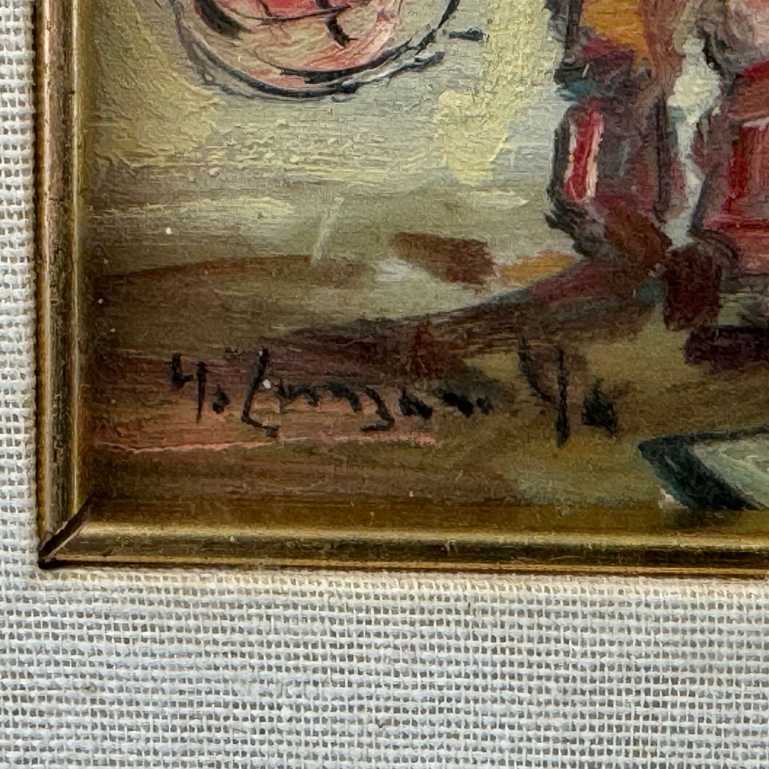 Dipinto olio su tavola, periodo XX secolo scuola Italiana, raffigurante Personaggi circensi su marina.