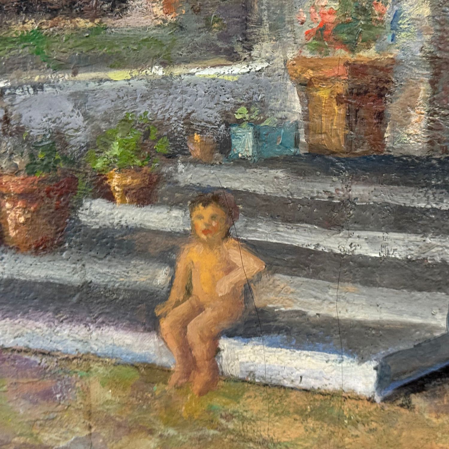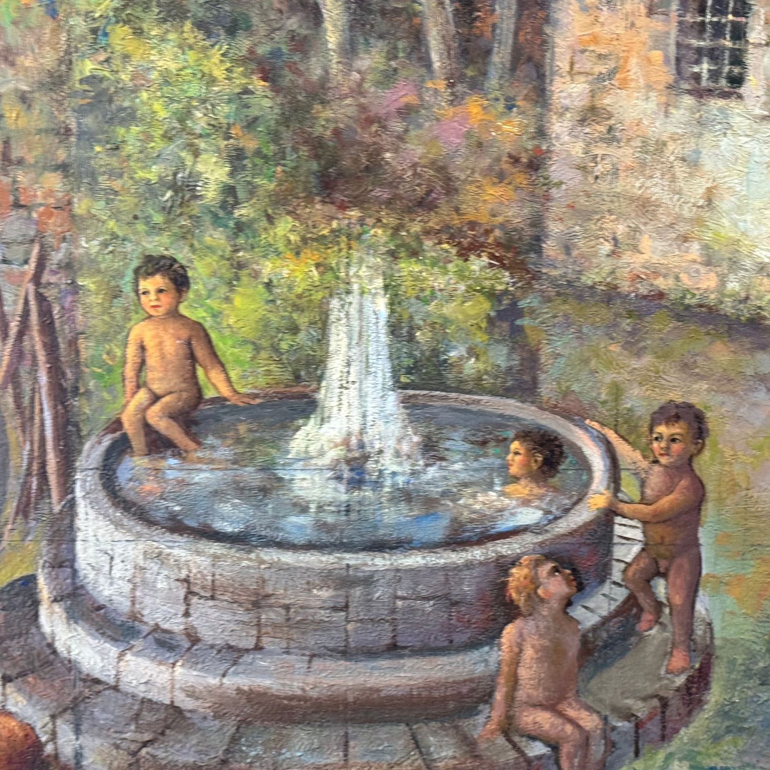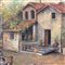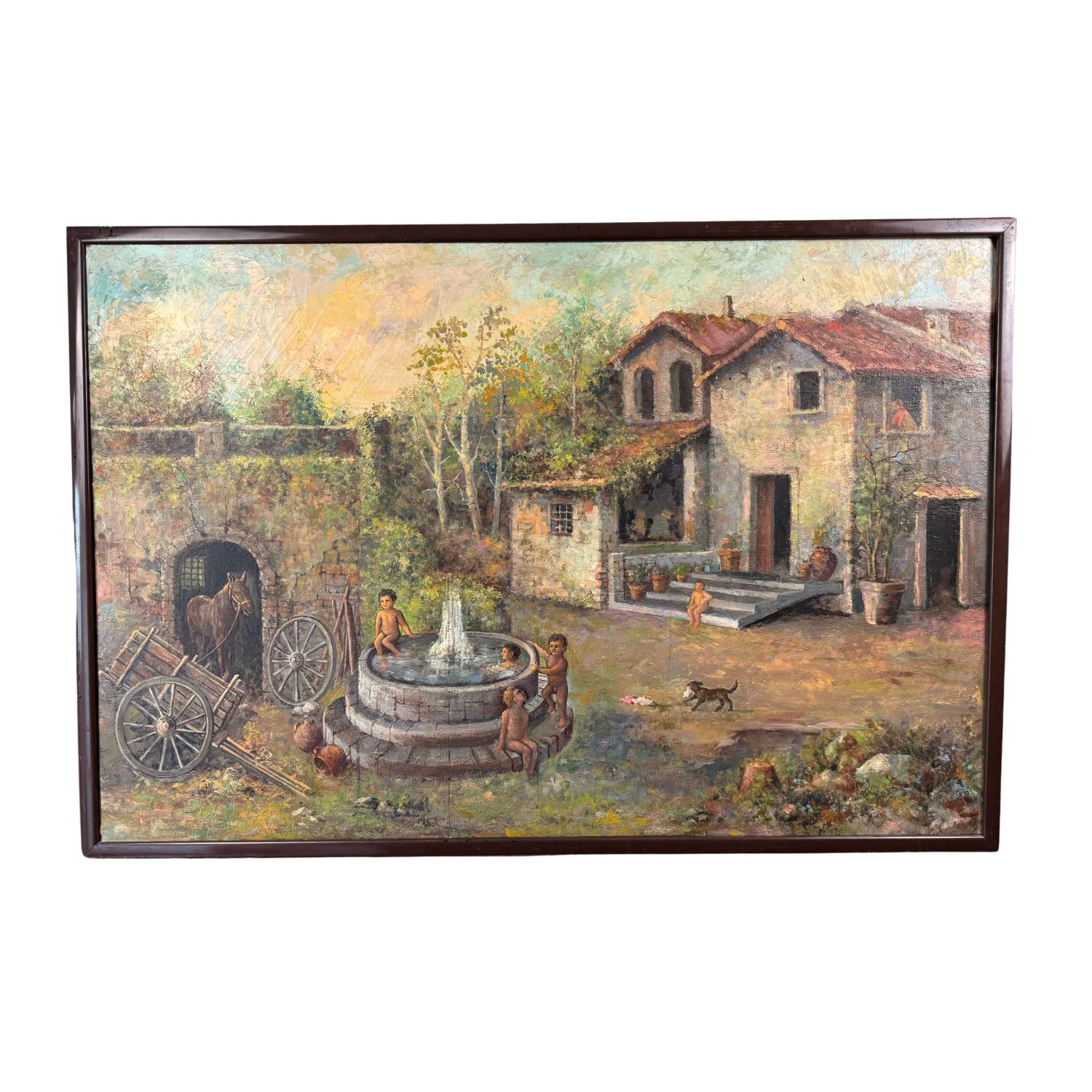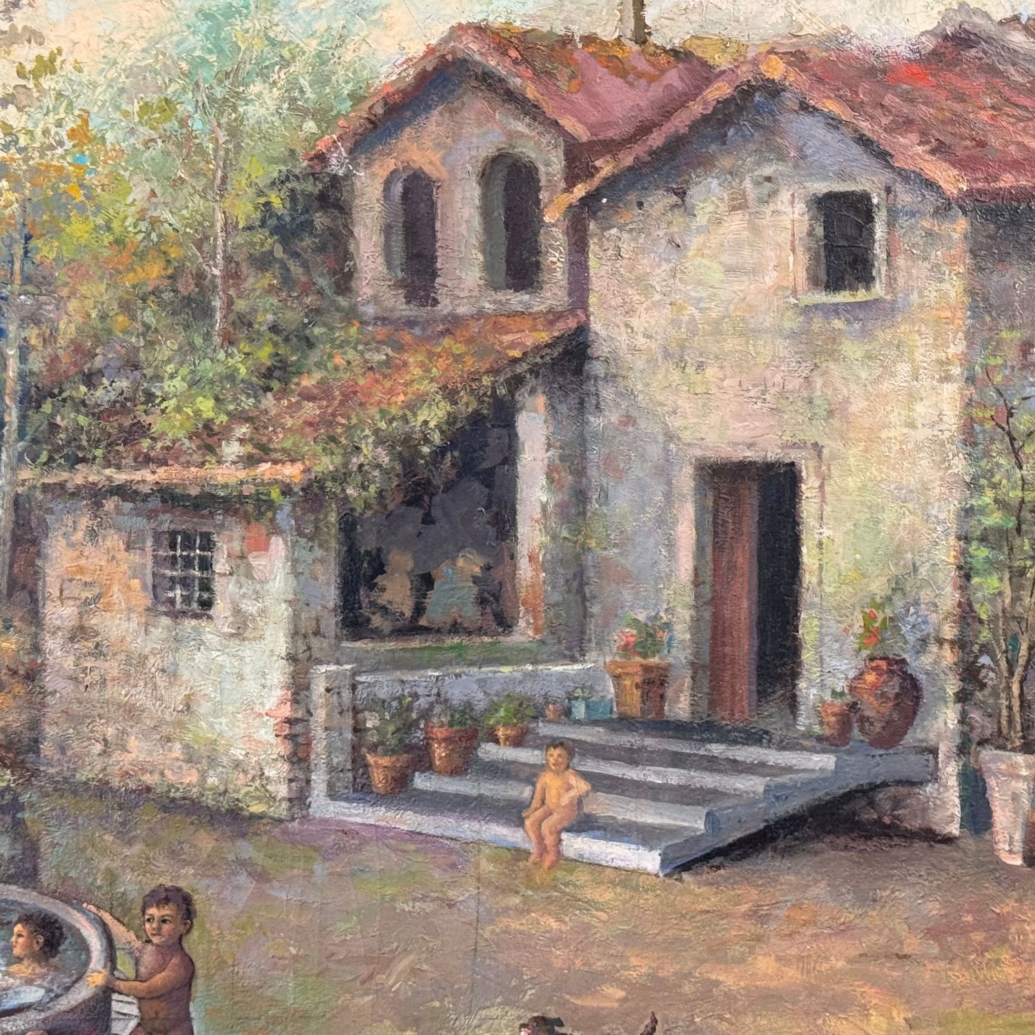 Dipinto olio su tela, periodo XX secolo scuola Italiana, raffigurante Giochi di bambini in fattoria.