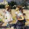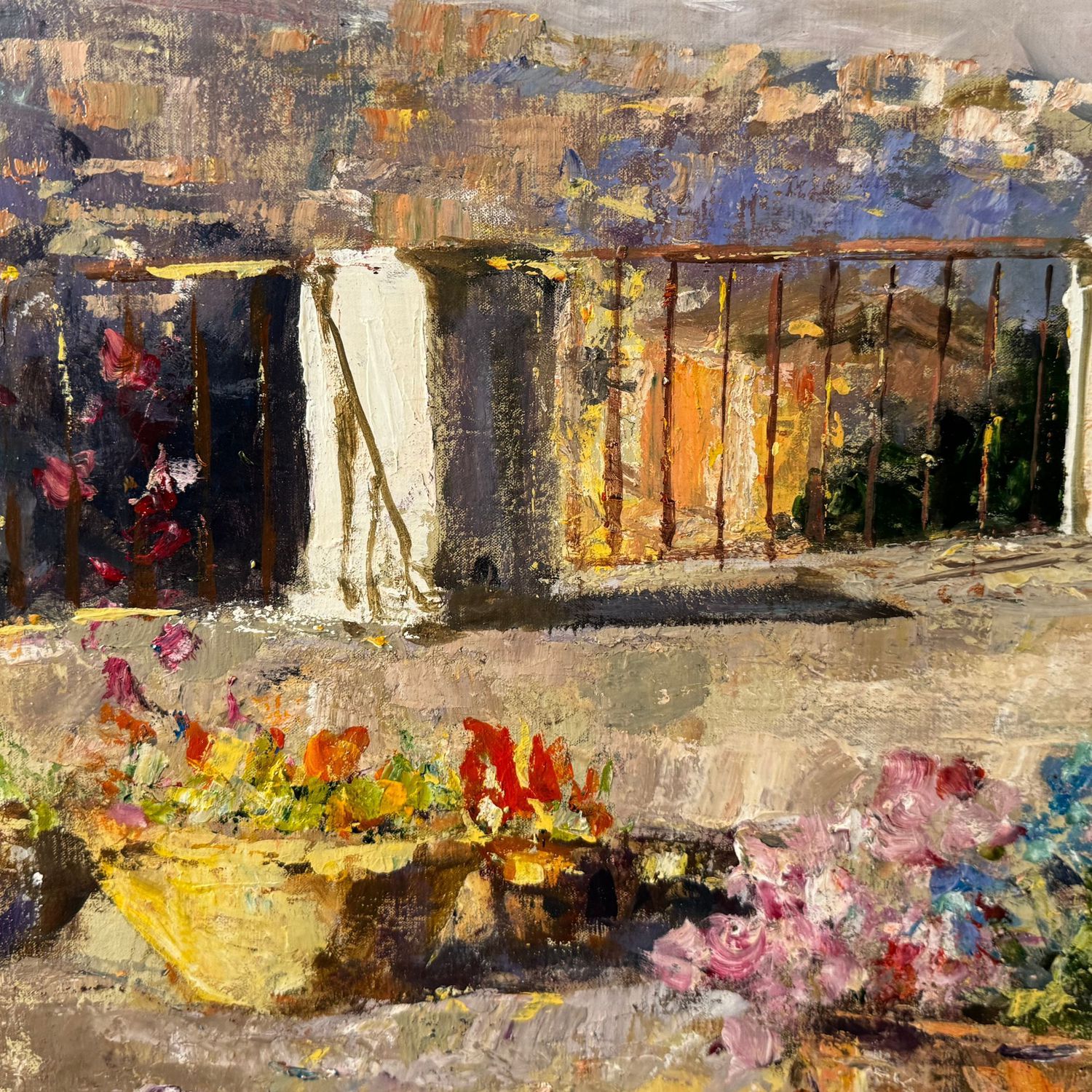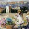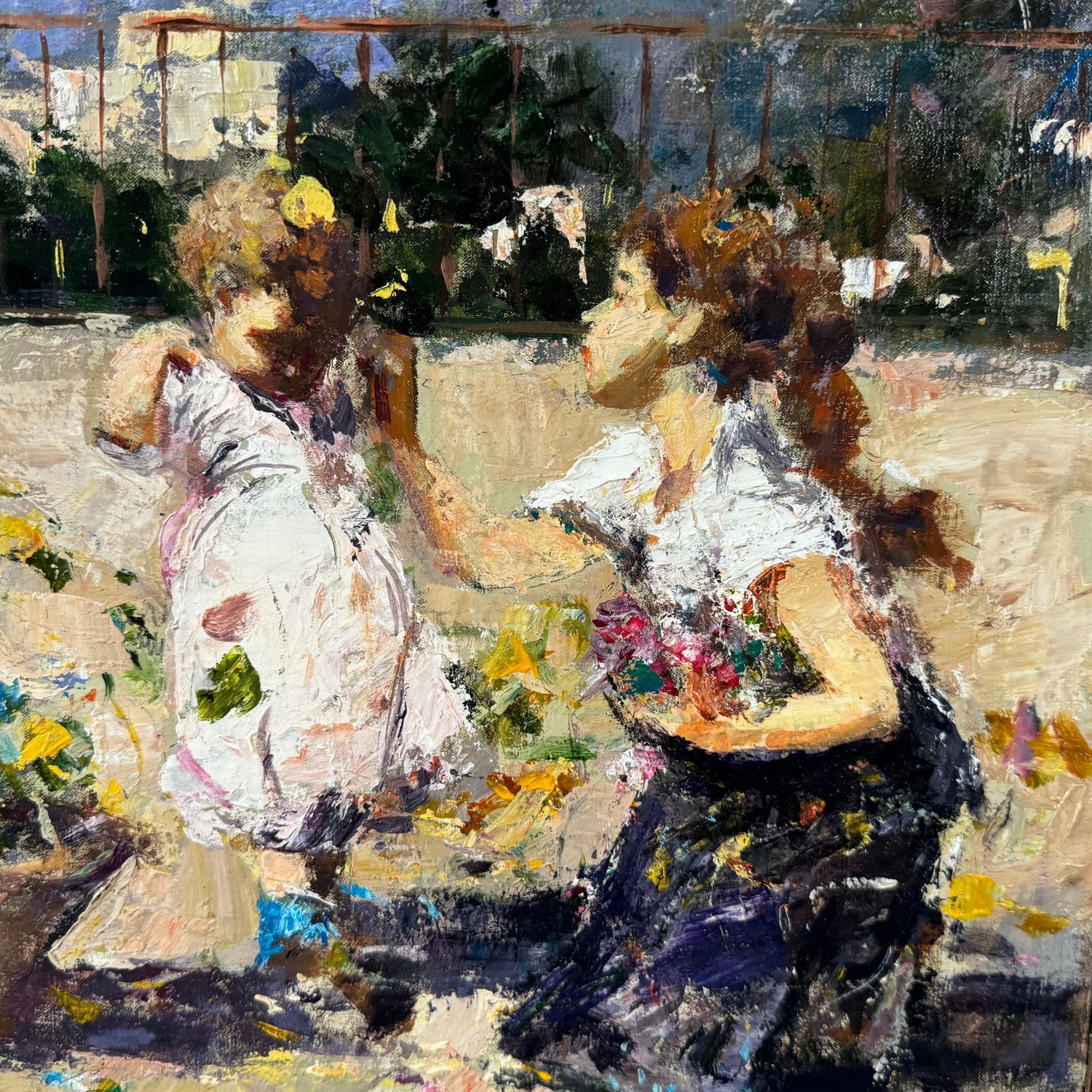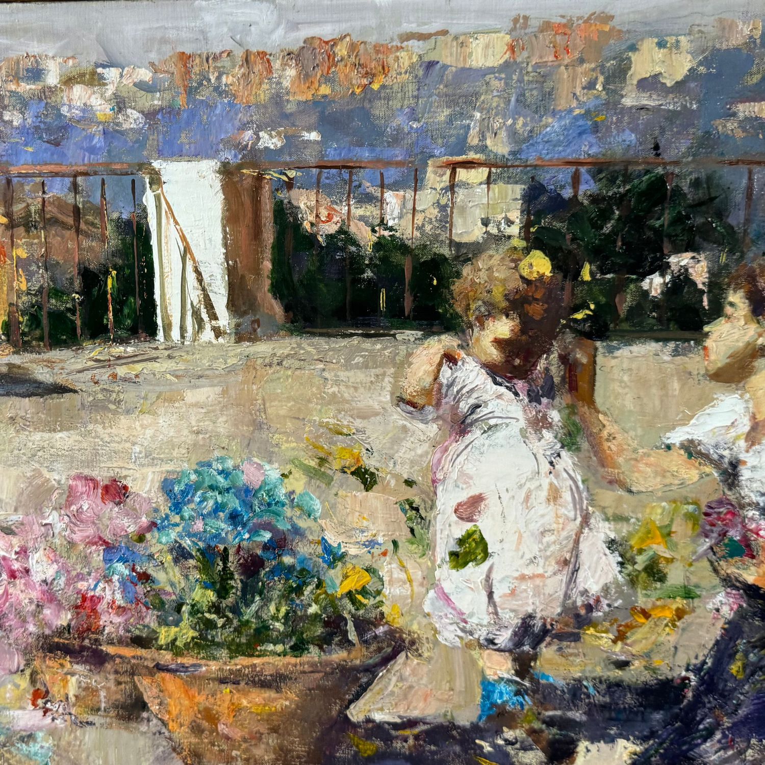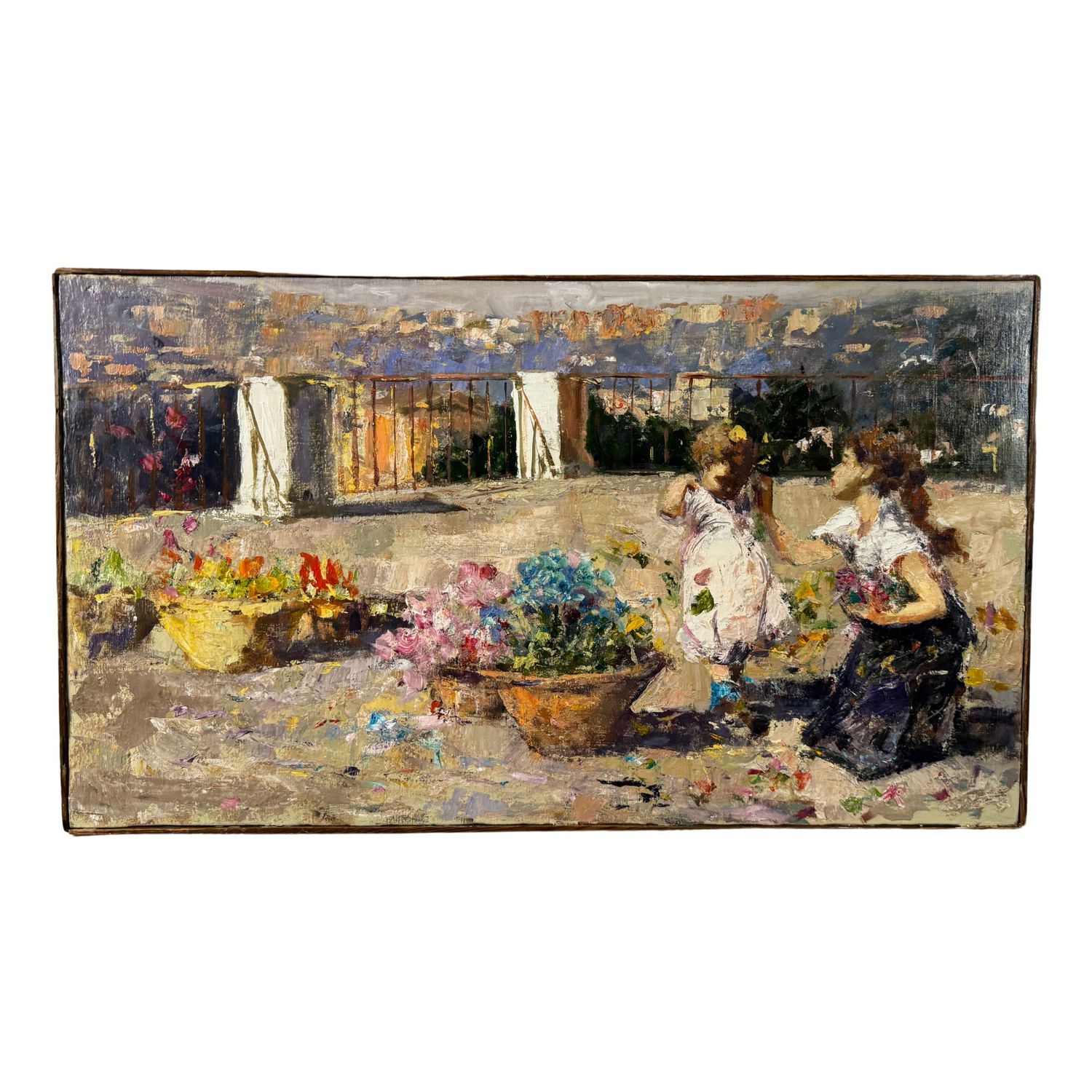 Dipinto olio su tela, periodo XX secolo scuola Napoletana, raffigurante Personaggi in terrazza.