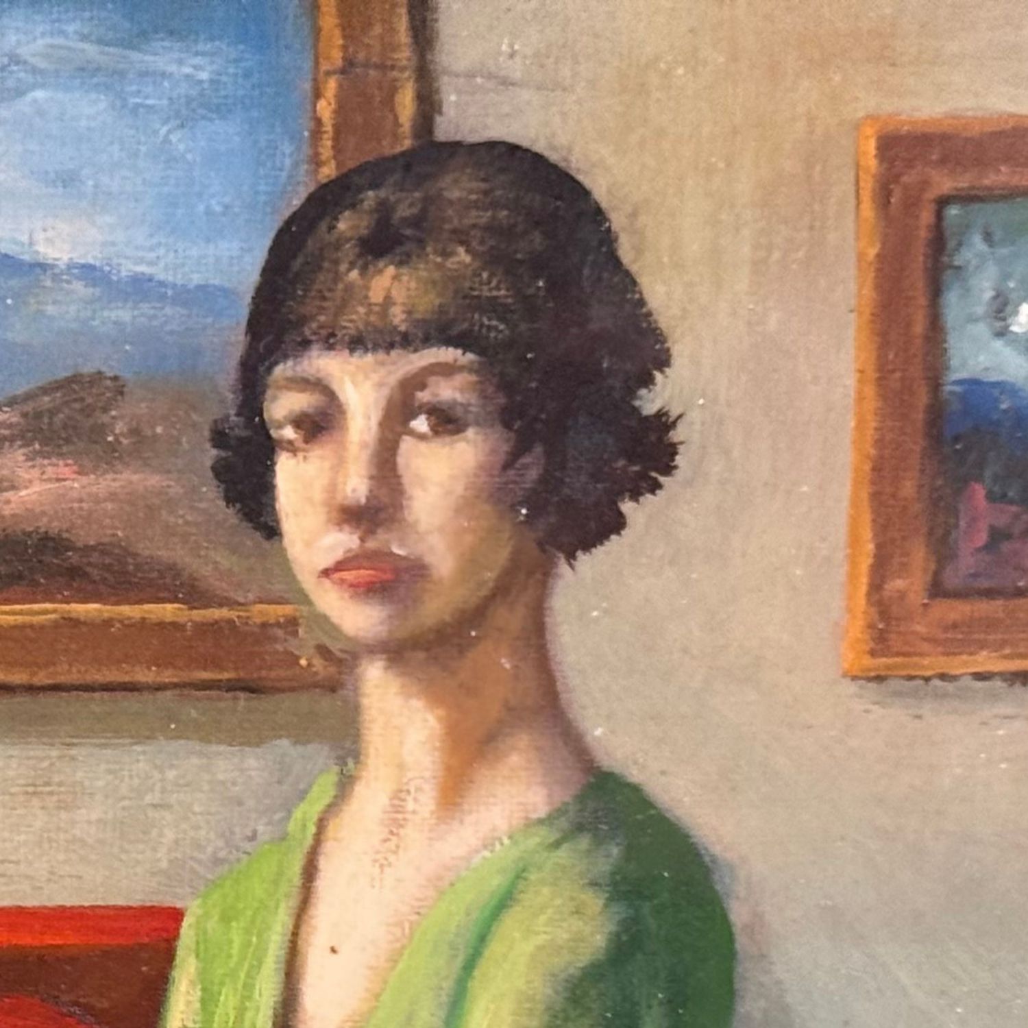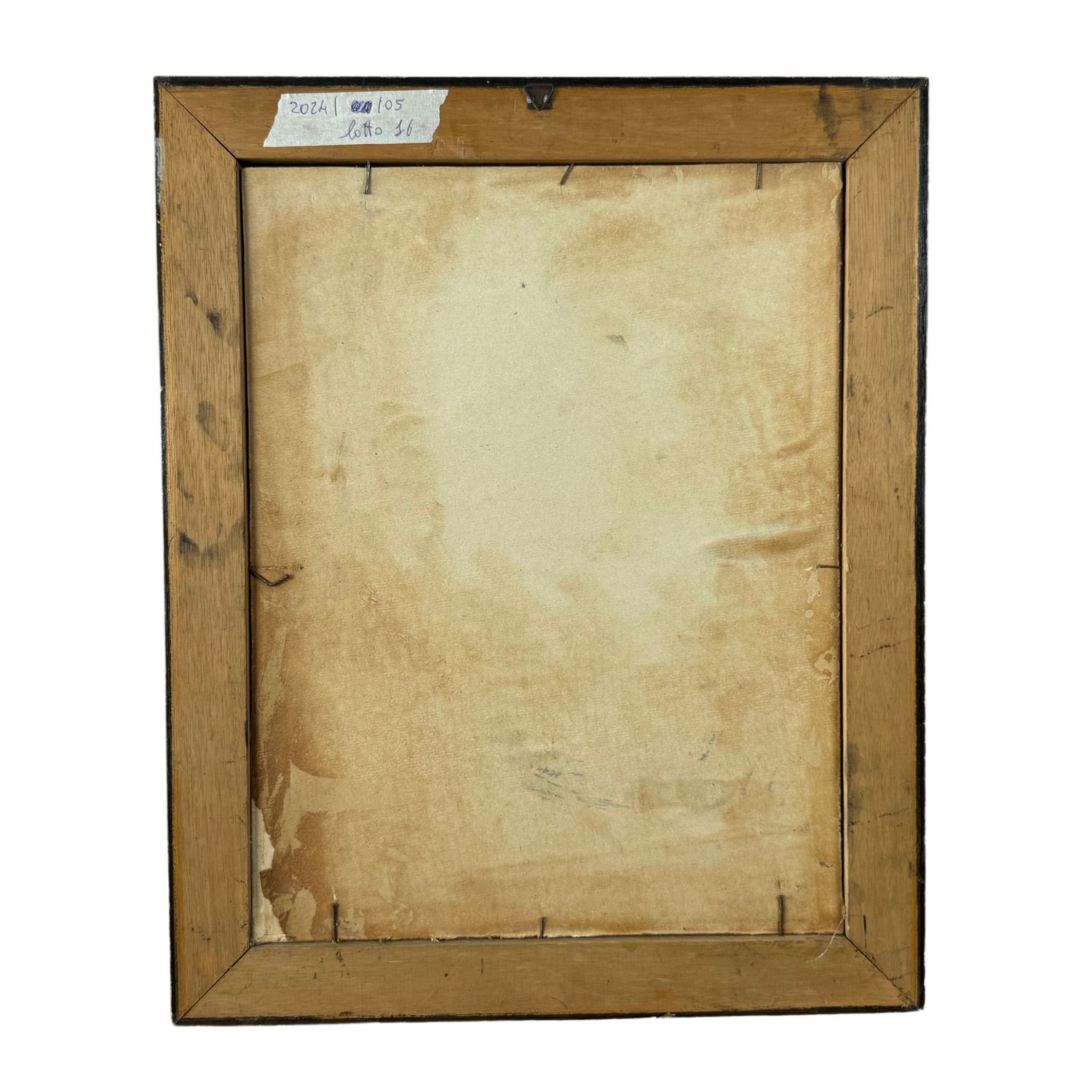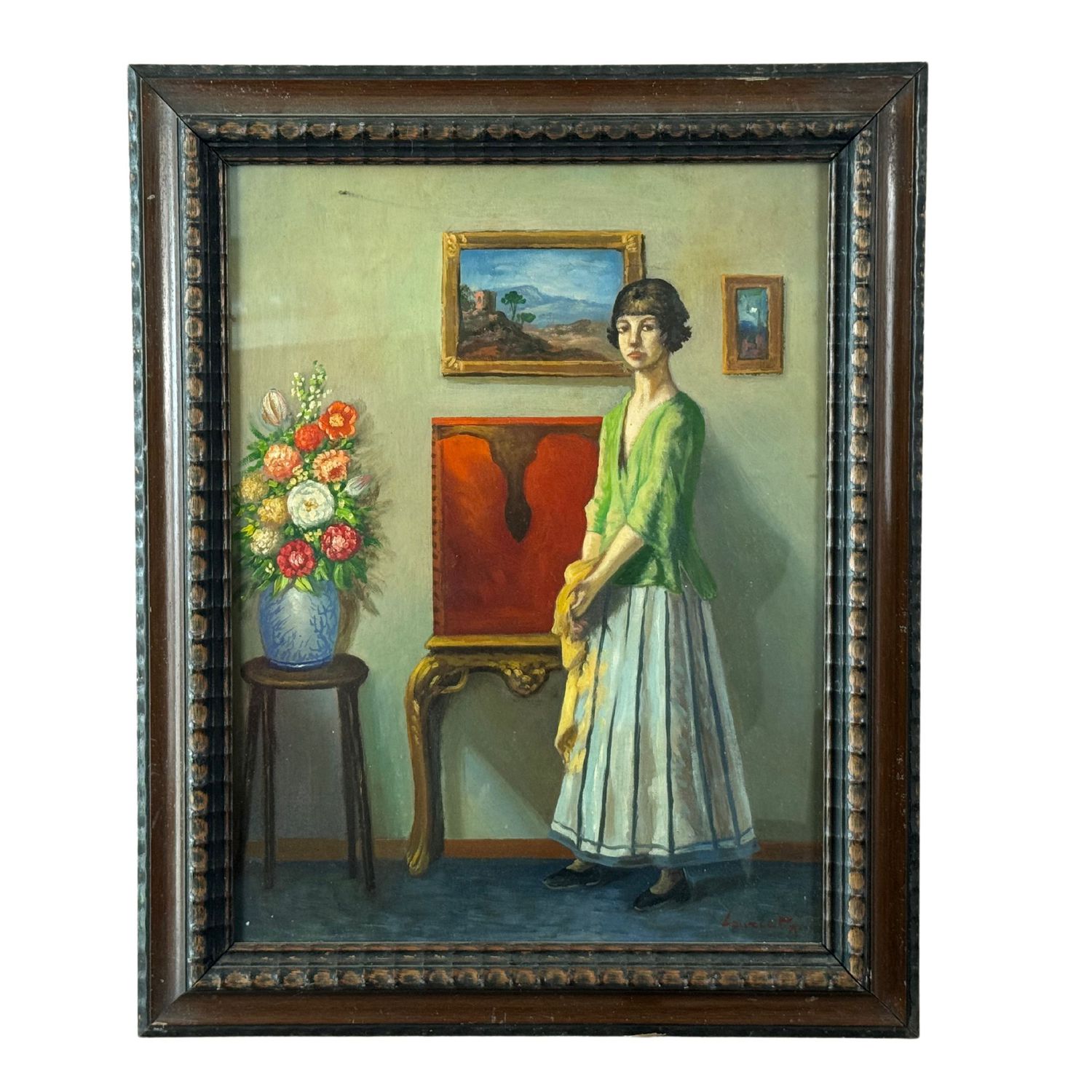 Dipinto olio su pannello, periodo XX secolo scuola Italiana, raffigurante Ritratto di donna in un interno. Dimensioni interno cornice: 30x40 cm. Dimensioni compreso cornice: 38x47 cm. Reca firma in basso a destra di difficile lettura. Opera in buone condizioni.