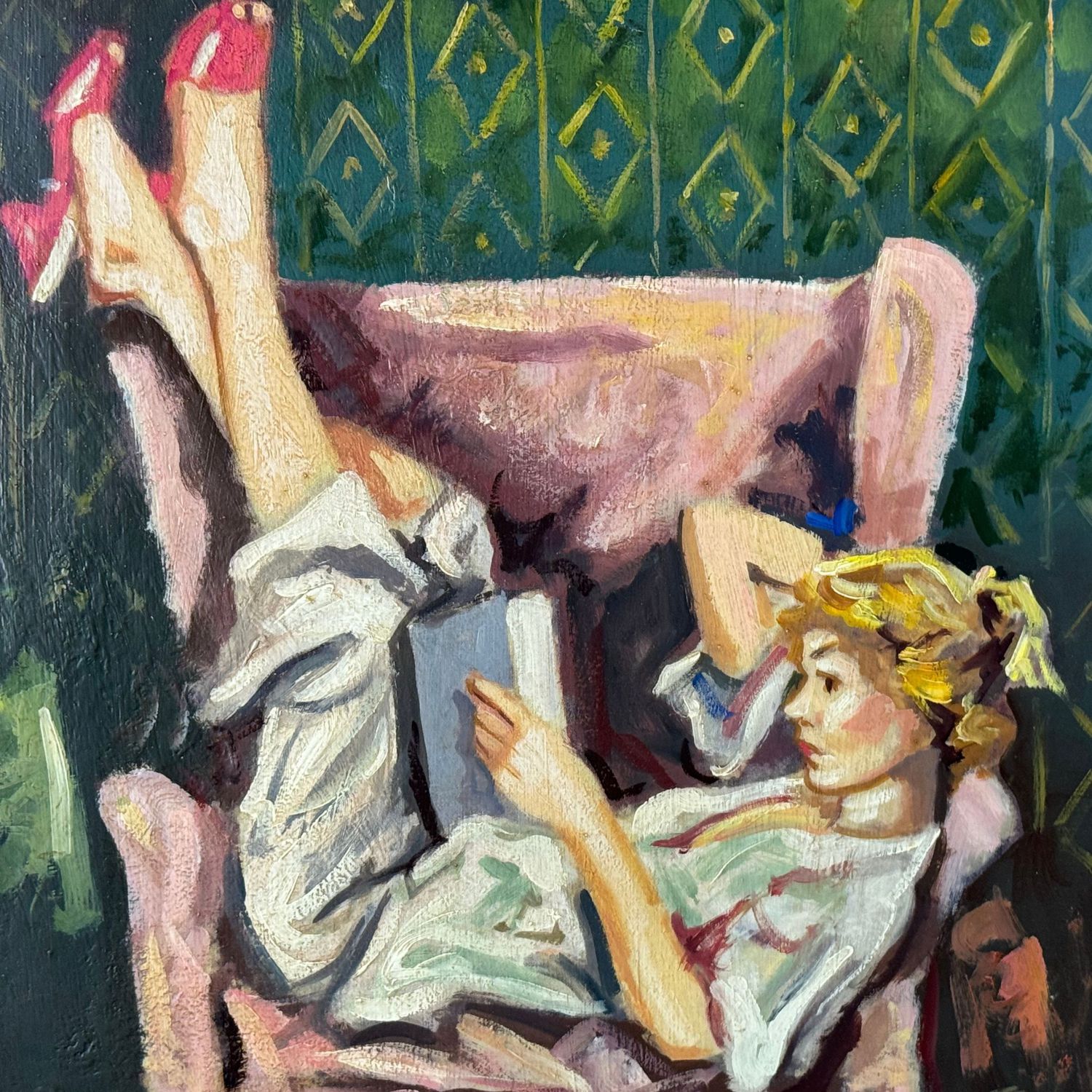 Dipinto olio su tela, periodo XX secolo scuola Italiana, raffigurante Donna in lettura. Dimensioni: 40x60 cm. Reca firma in basso a sinistra di difficile lettura. Opera in buone condizioni.
