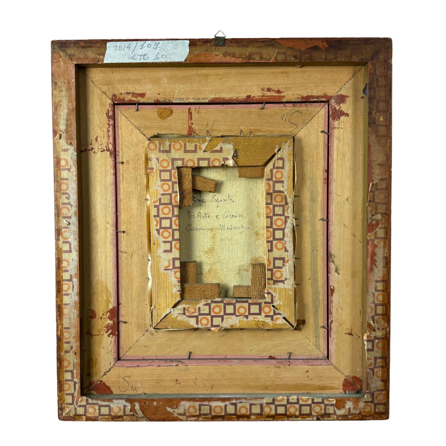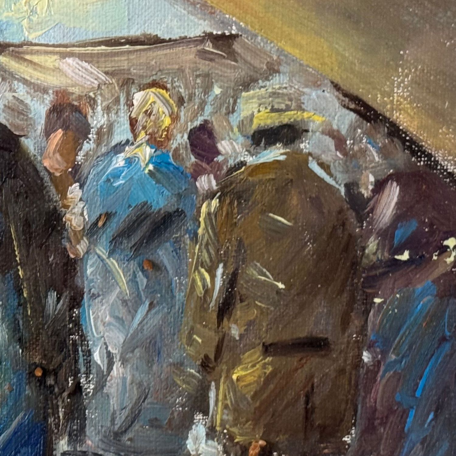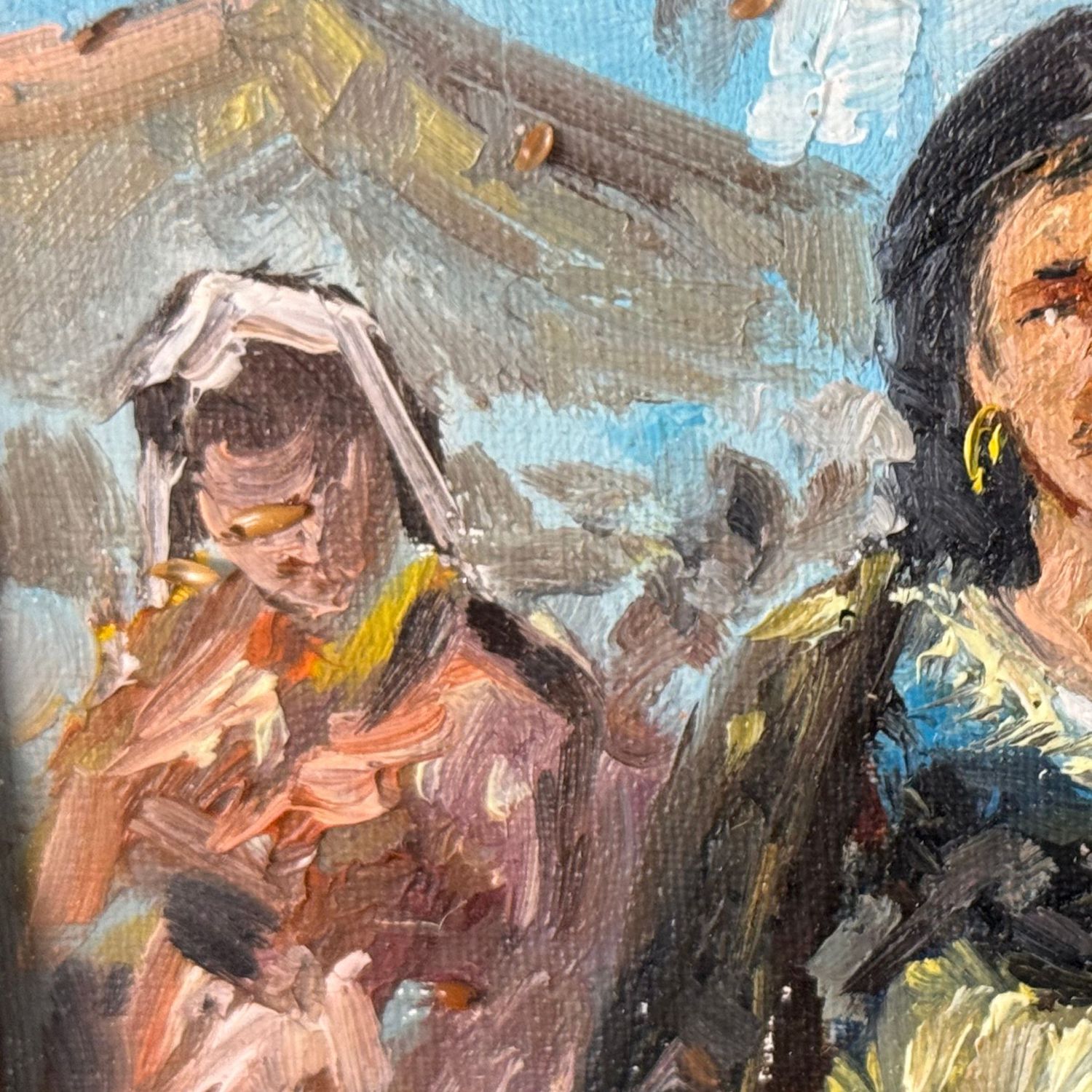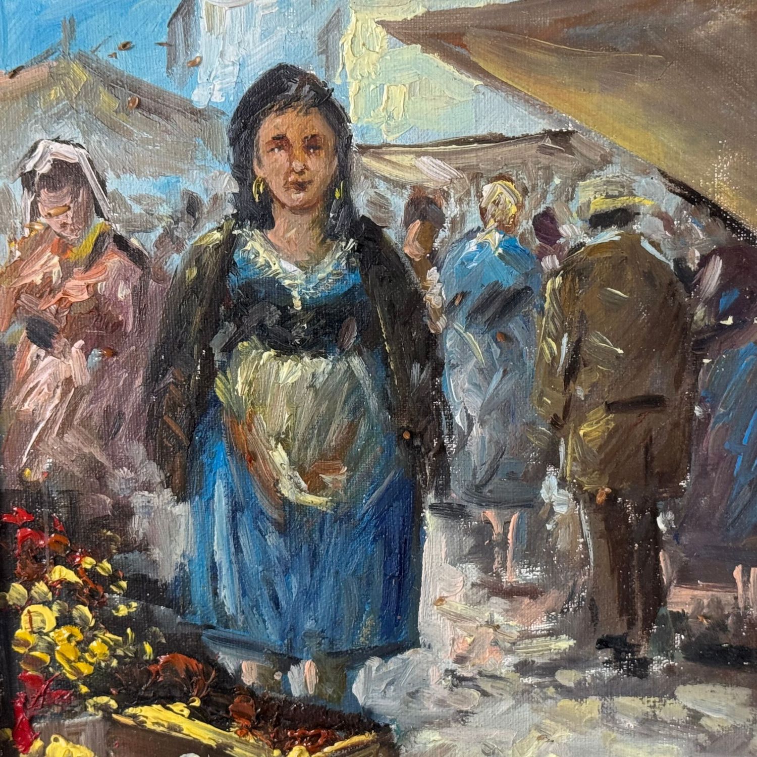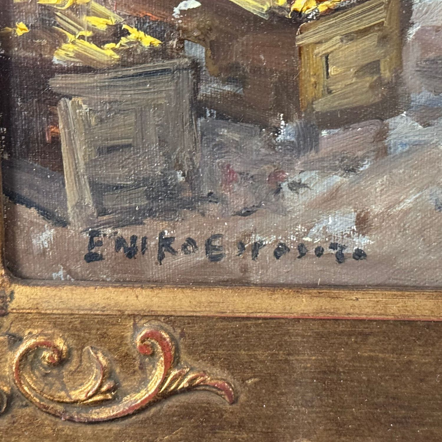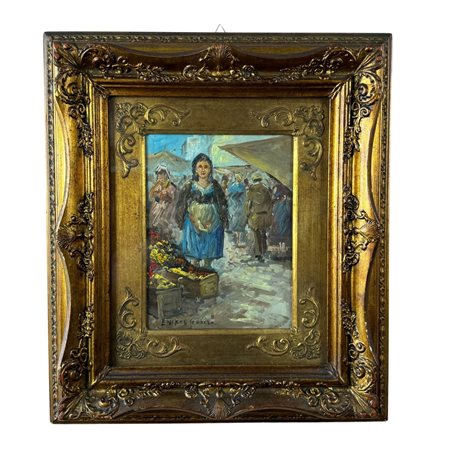 Dipinto olio su tela, periodo XX secolo scuola Italiana, raffigurante Scena di mercatino. Dimensioni interno cornice: 18x24 cm. Dimensioni compreso cornice: 42x48 cm. Reca firma in basso a sinistra da Eniko Esposito. Opera in buone condizioni.